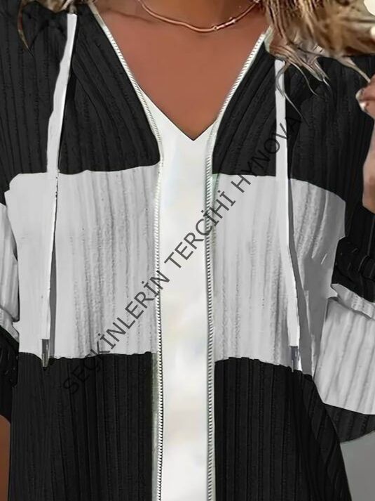 Kadın Uzun Kollu Kapşonlu önden Fermuarlı Blok Desenli şardonlu Kaşkorse Ceket