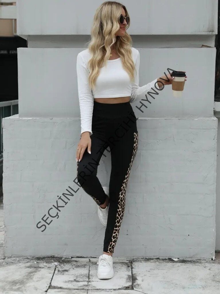 Kadın Yüksek Bel Cep Detaylı Leopar Desenli Dalgıç Tayt