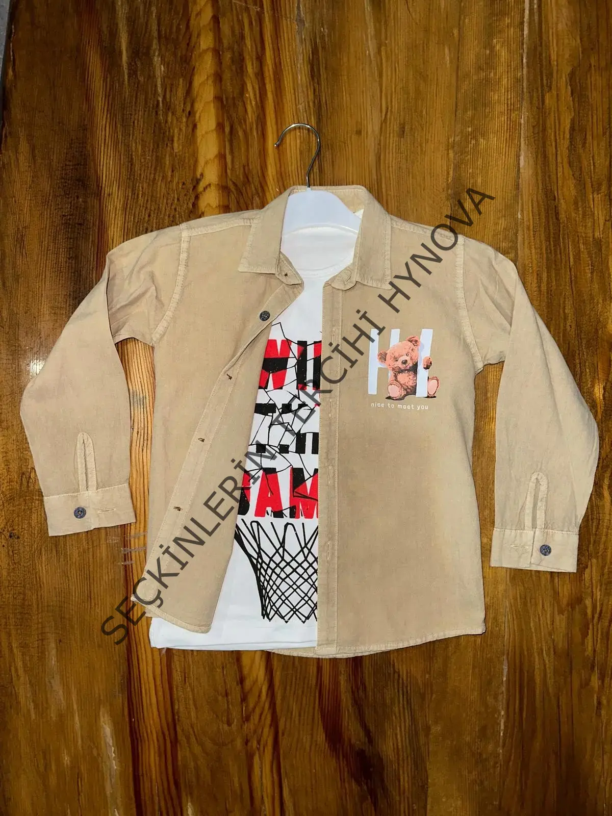 Aydınlık ve enerjik kombinler için ideal, 9-13 yaş tişört gömlek kombini vizon renk seçeneğiyle!