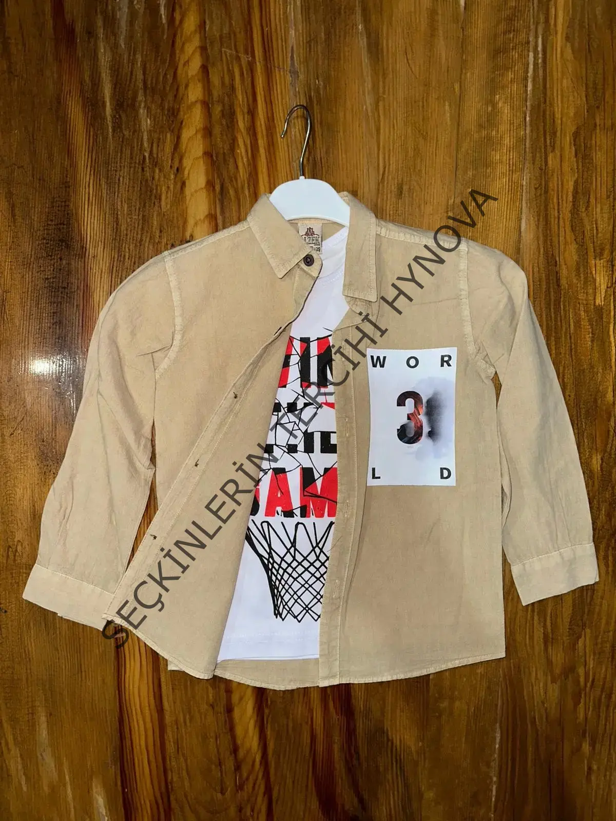 Aydınlık ve enerjik kombinler için ideal, 9-13 yaş tişört gömlek kombini vizon renk seçeneğiyle!