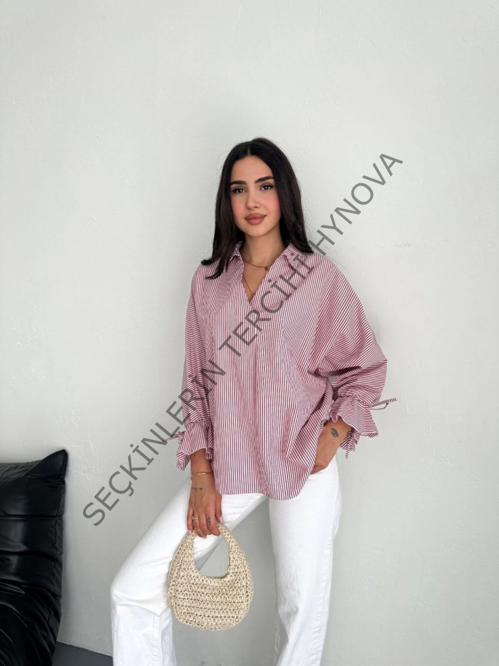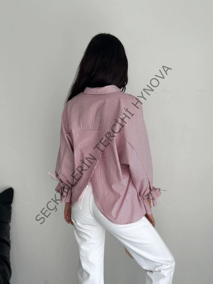 Arkası Asimetrik Yırtmaç Kesim Detaylı Cizgili Bluz Gömlek - Bordo