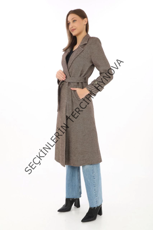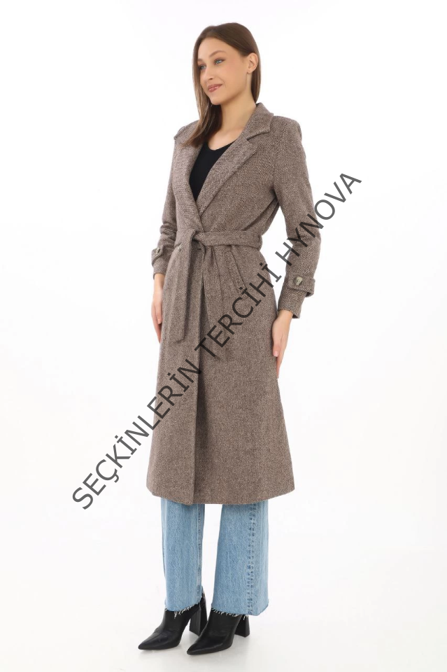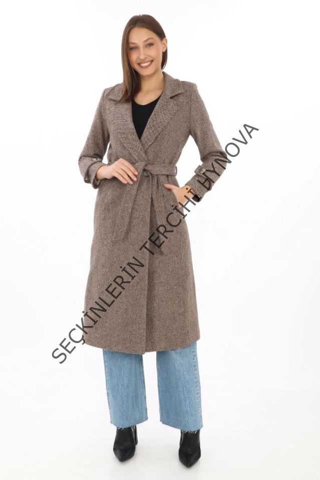 Balık Sırtı Kaşe Kaban – Uzun Boy Kruvaze Yaka Kuşaklı Astarlı Kışlık Tesettür Kaban, Yünlü Dokuma Kaşmir Kumaş, Cepli Rahat Oversize Kalıp Şık Modern Kaban Mont Modeli (Günlük Ve Özel Gün Kombinlerine Uygun) - Vizon