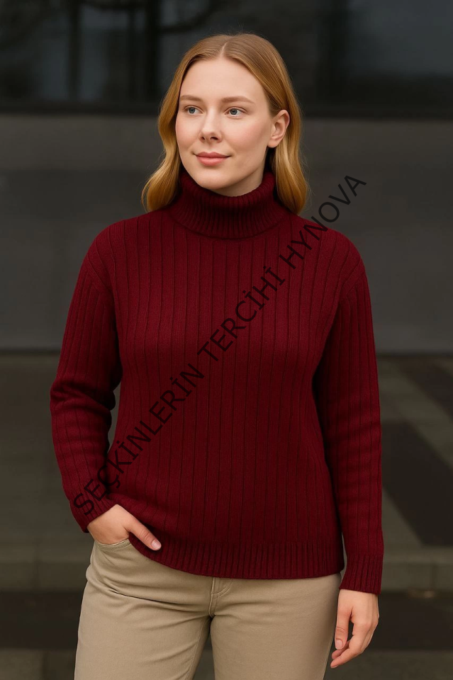 Balıkcı Yaka Bağazlı Triko Kazak Pamuklu Kalın Fitilli Dokuma - Bordo
