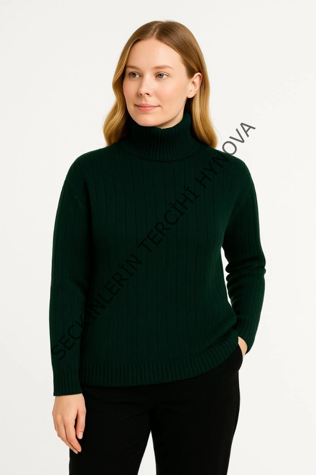 Balıkcı Yaka Bağazlı Triko Kazak Pamuklu Kalın Fitilli Dokuma - Haki