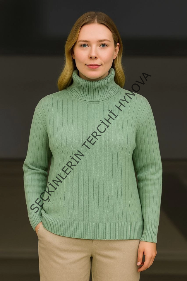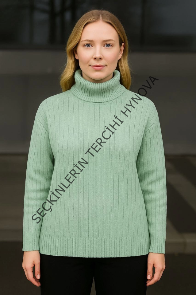 Balıkcı Yaka Bağazlı Triko Kazak Pamuklu Kalın Fitilli Dokuma - Mint Yeşili