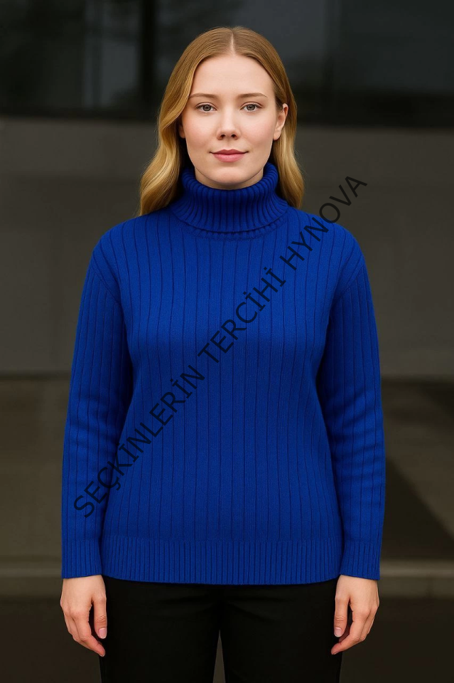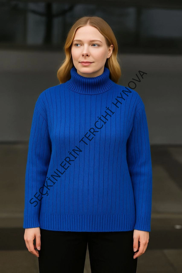 Balıkcı Yaka Bağazlı Triko Kazak Pamuklu Kalın Fitilli Dokuma - Saks Mavisi