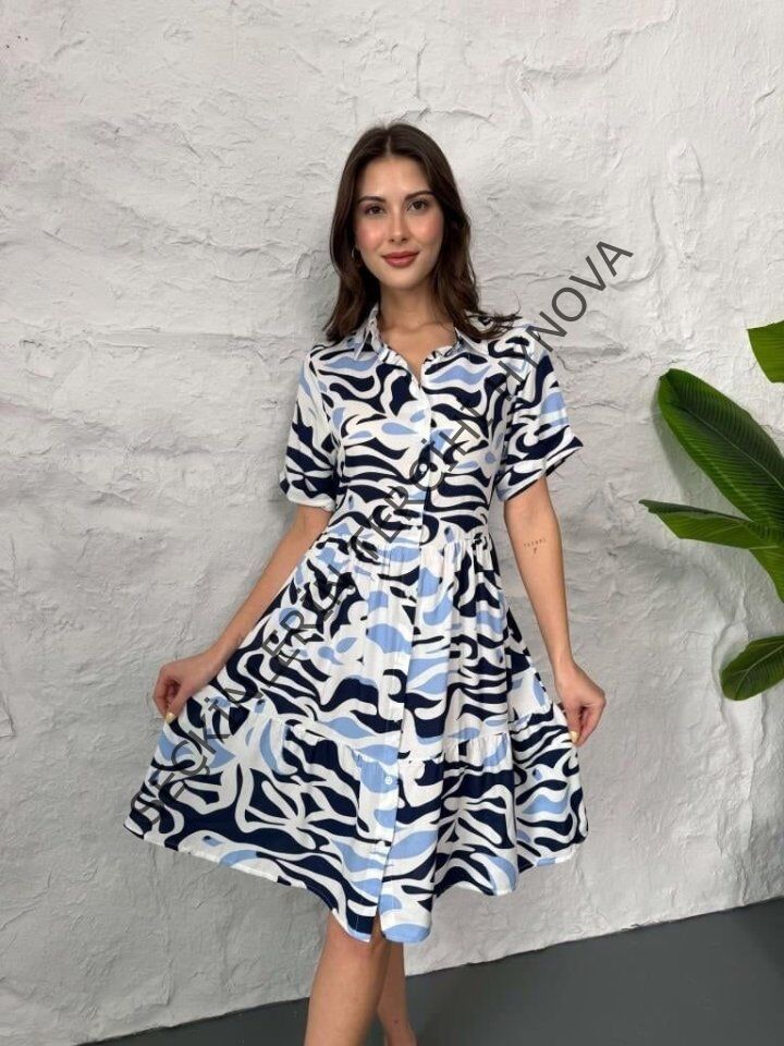Baskılı Keten Elbise - Lacivert