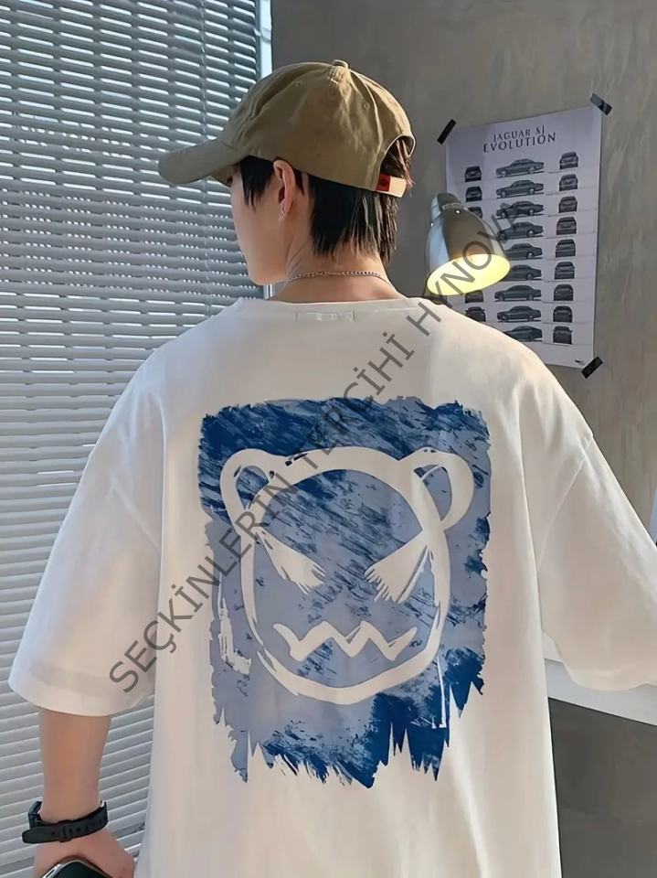 Baskılı Oversize Bisiklet Yaka T-shirt - Beyaz