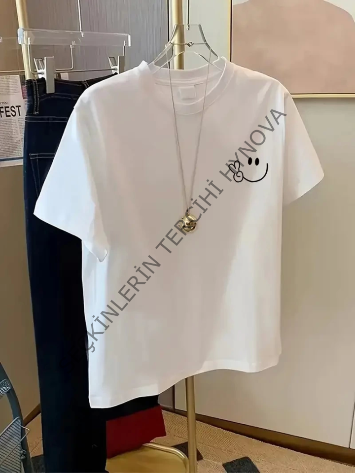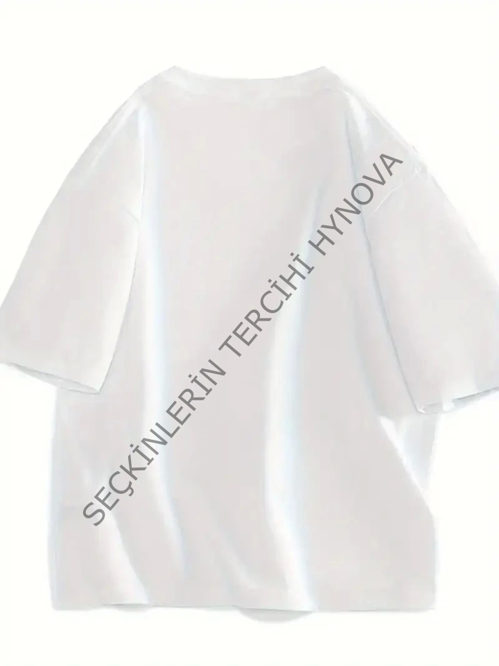 Baskılı Oversize Bisiklet Yaka T-shirt - Beyaz