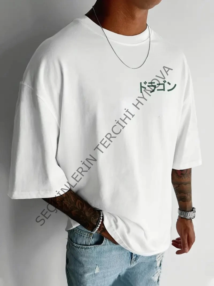 Baskılı Oversize Bisiklet Yaka T-shirt - Beyaz