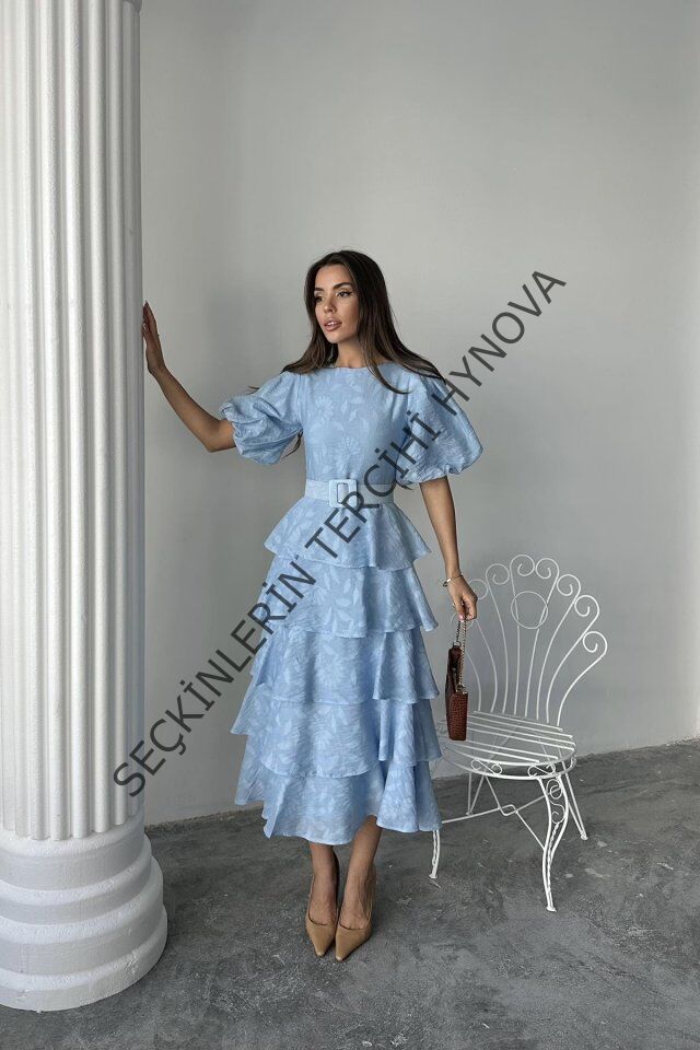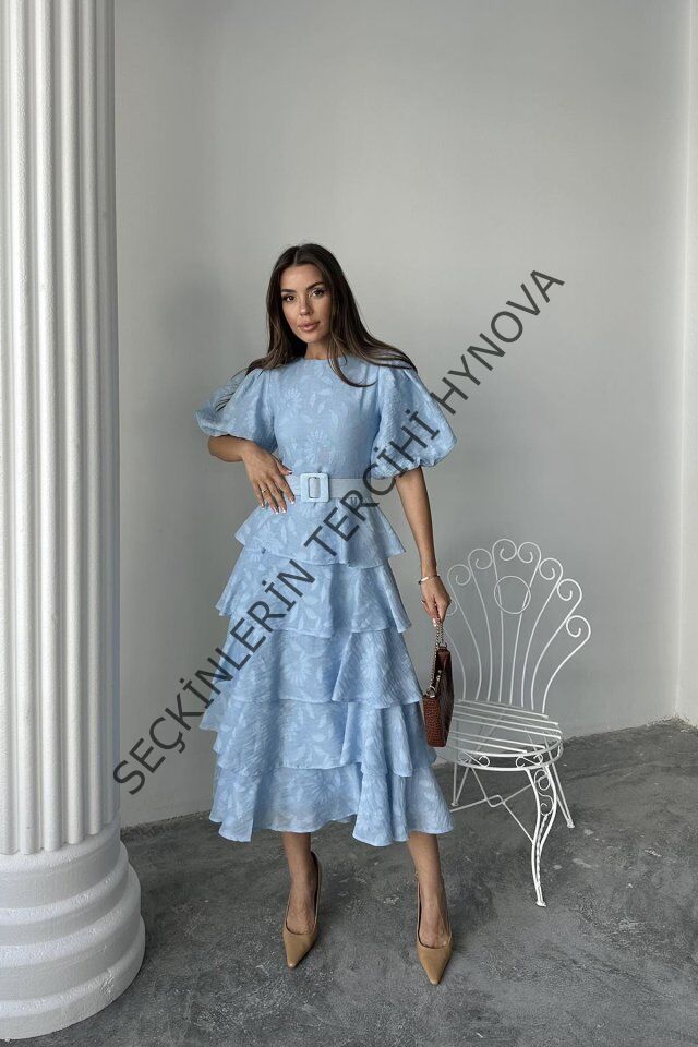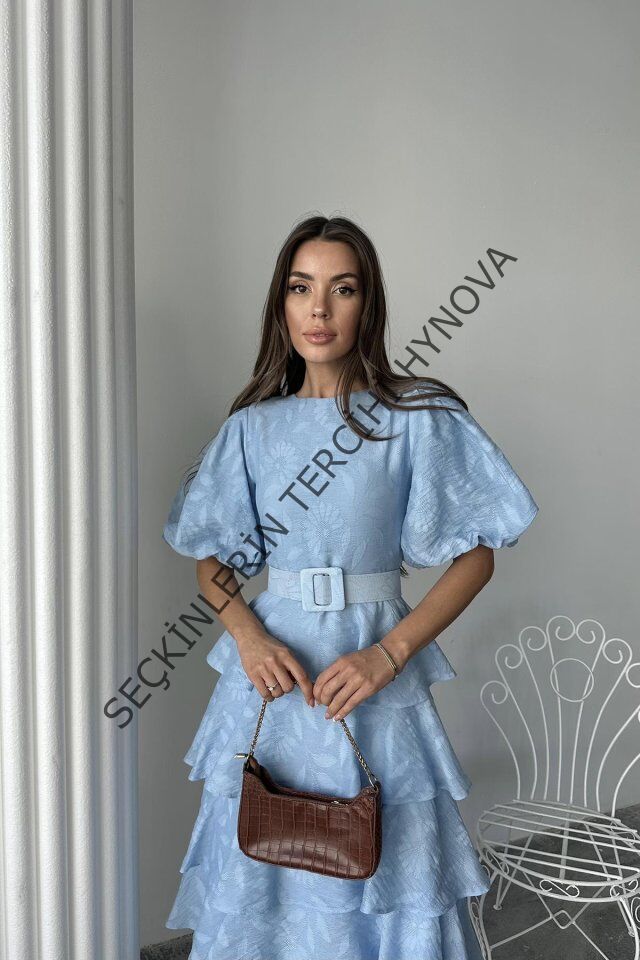 Bebe Mavi Kat Kat Balon Kollu Kemerli Elbise