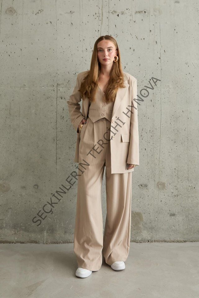 Bej Çizgili Ceket - Yelek Ve Pantolon Takım