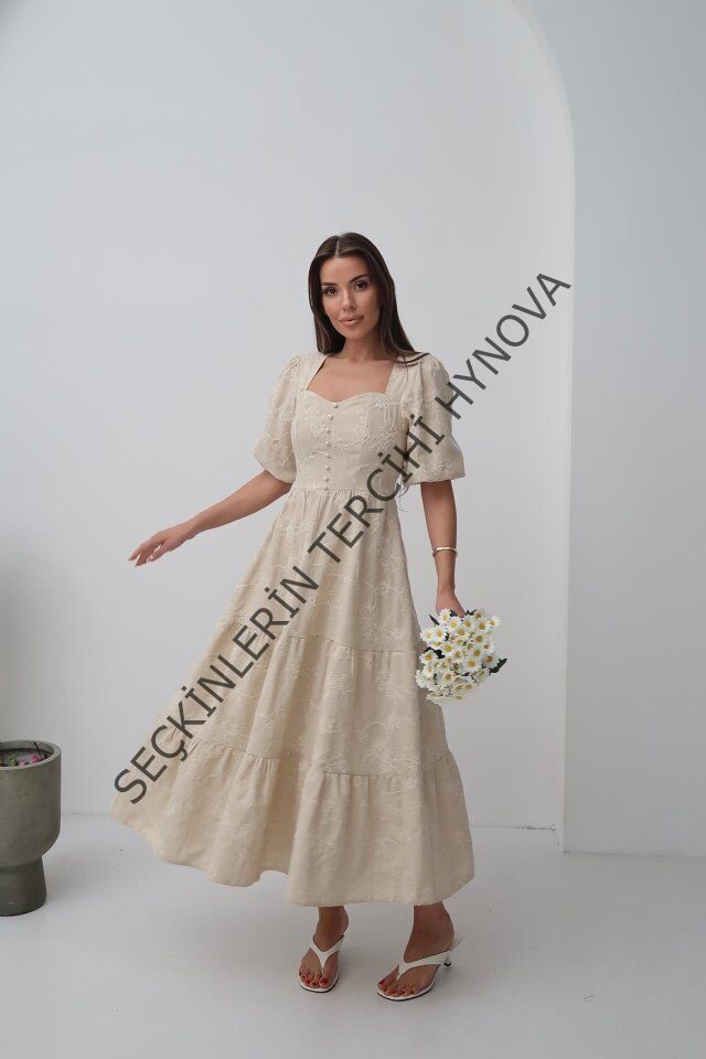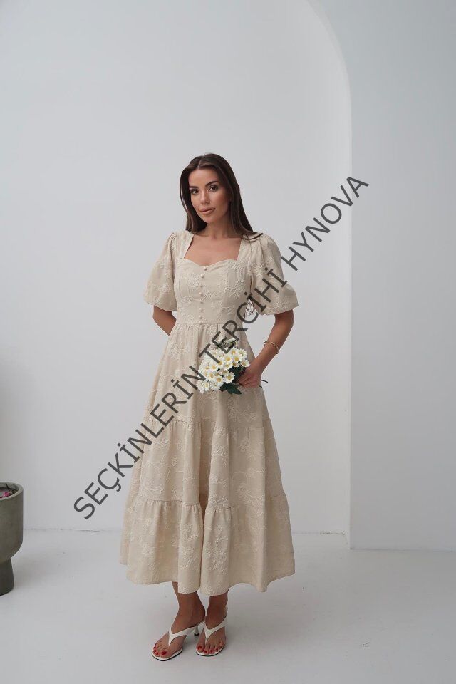 Bej Süs Düğmeli Balon Kollu Elbise