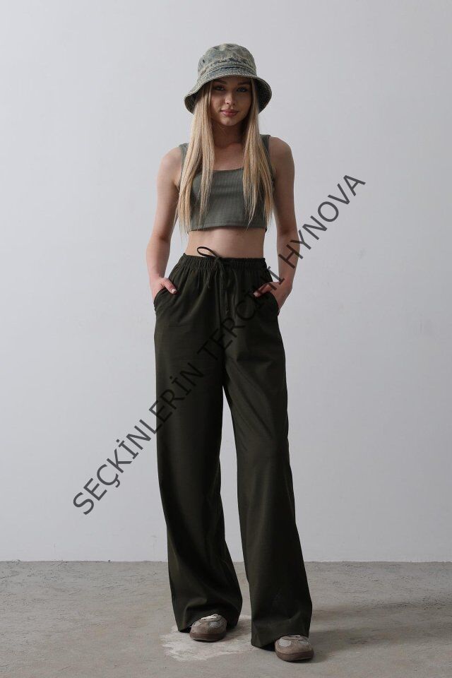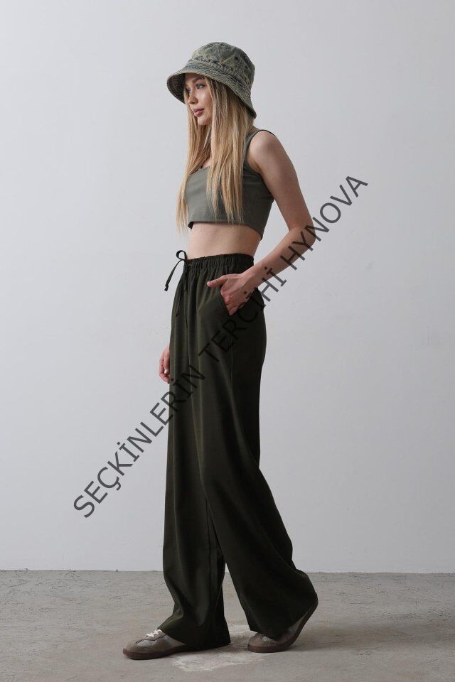 Beli Lastikli Bol Paça Pantolon - Koyu Haki