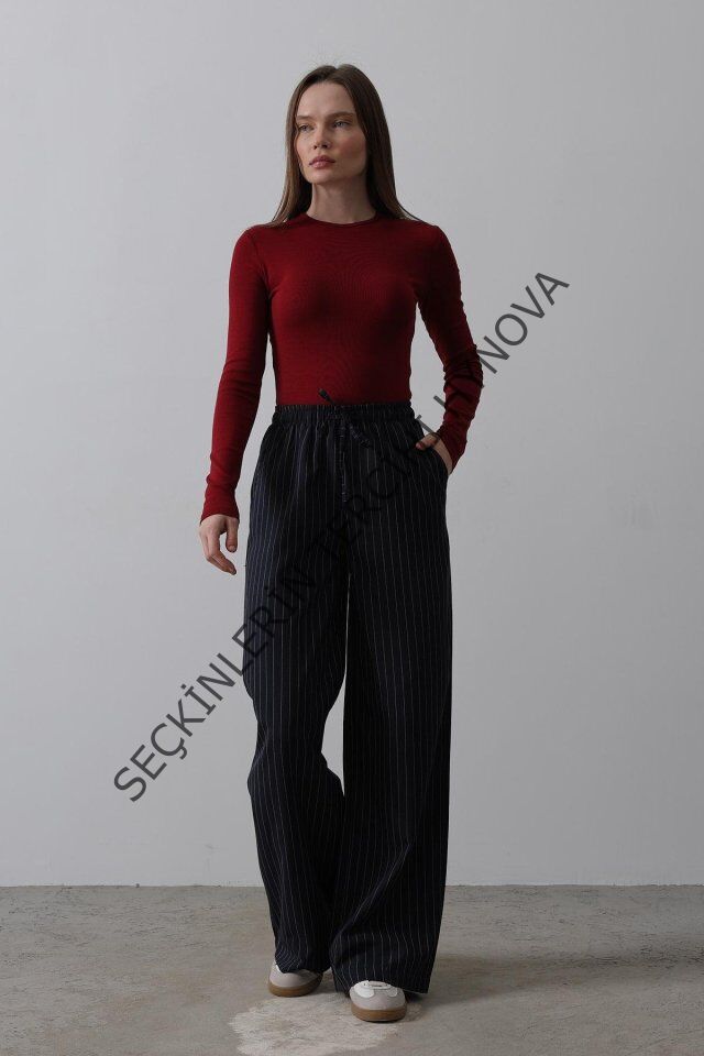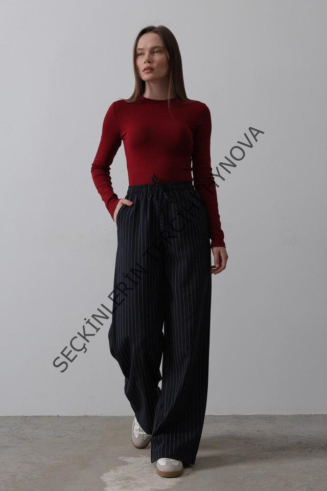 Beli Lastikli Bol Paça Pantolon - Lacivert-Beyaz
