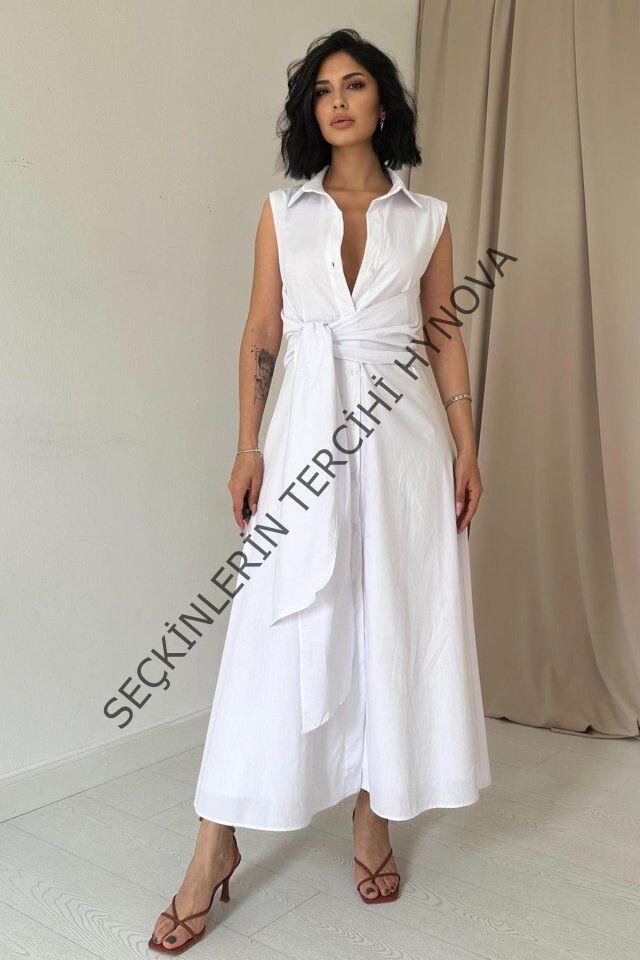 Beyaz Gömlek Yaka Bağlamalı Elbise