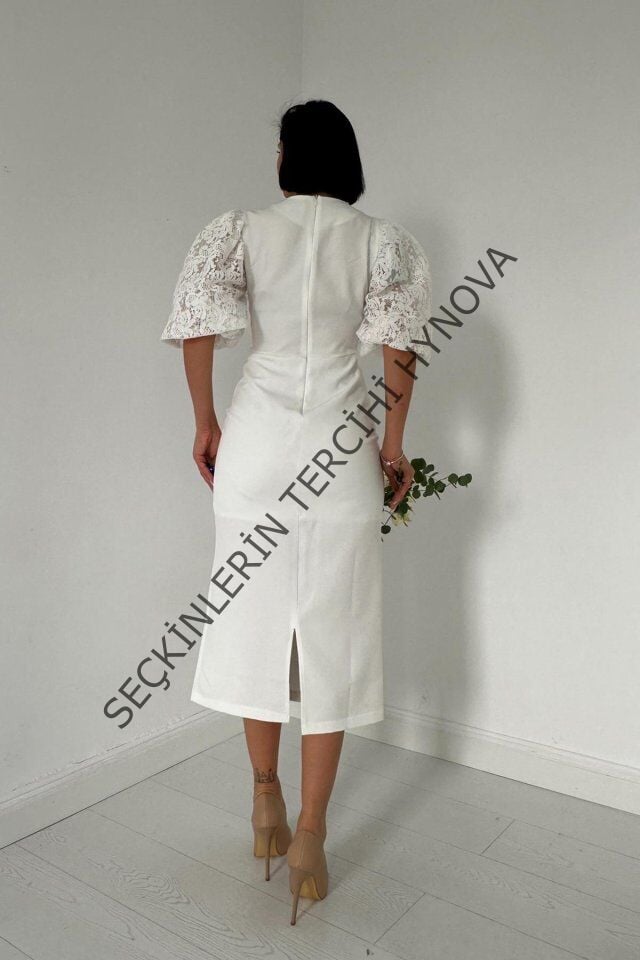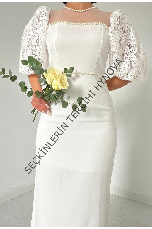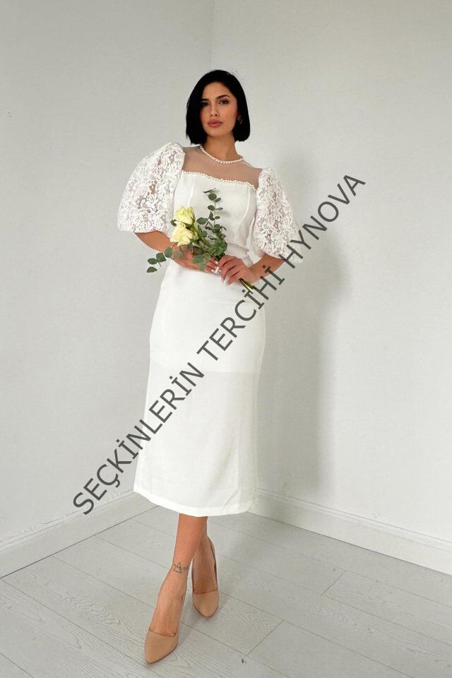 Beyaz İncili Tül Detay Elbise