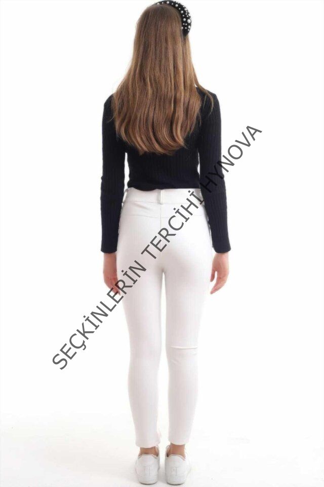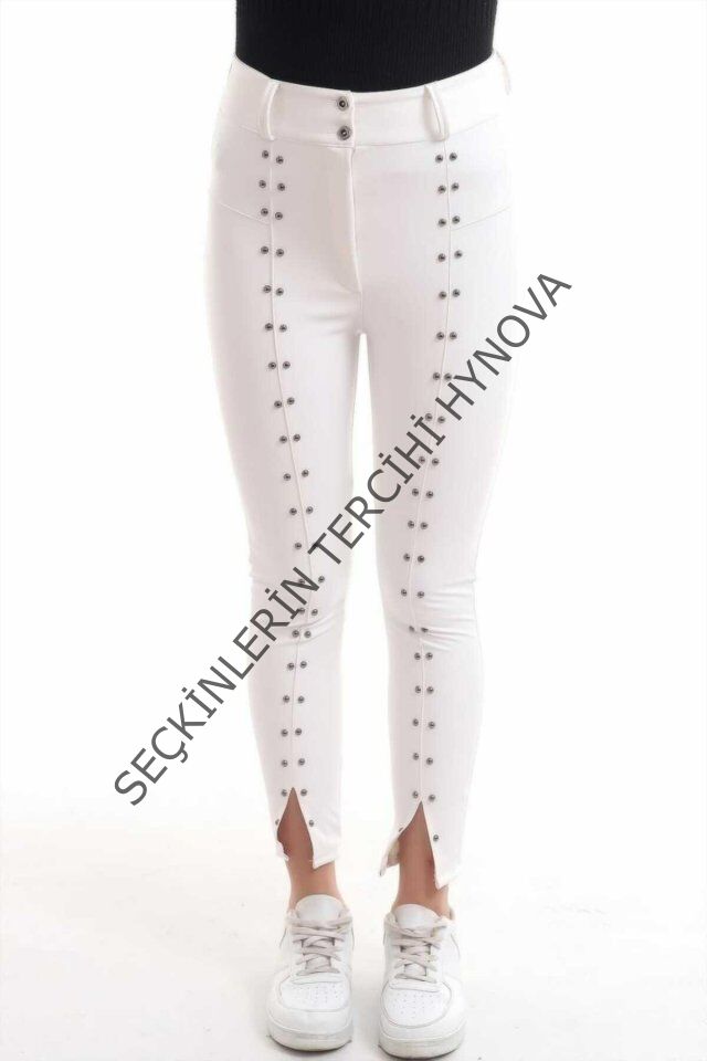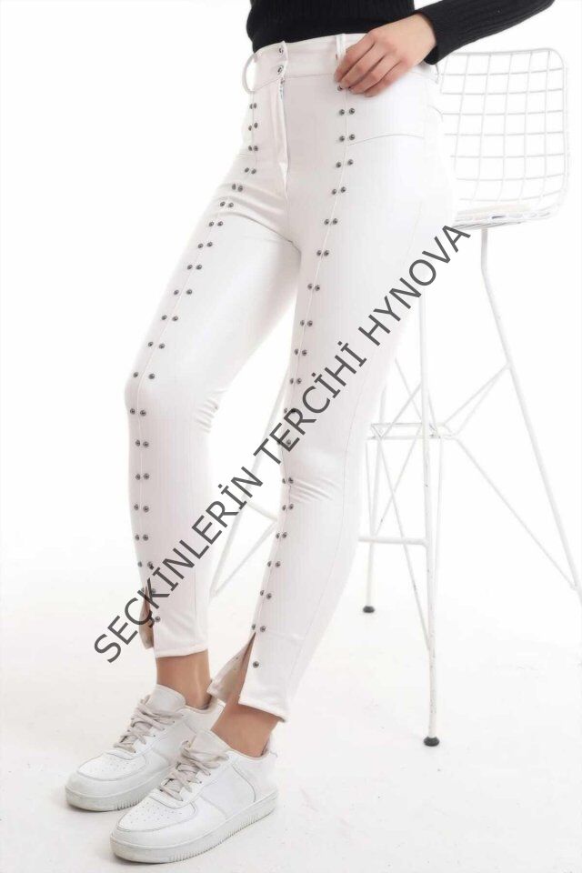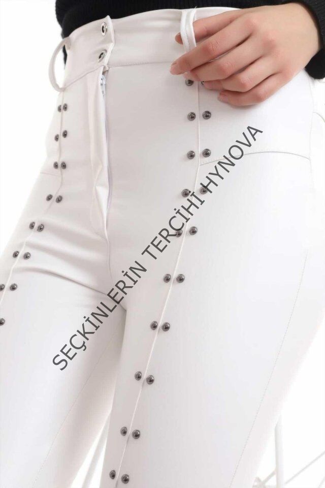 Beyaz Taş İşlemeli Deri Tayt