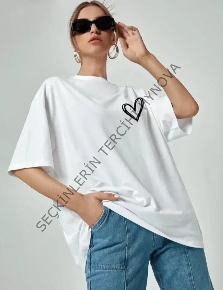 Bisiklet Yaka Baskılı Oversize T-Shirt - Beyaz
