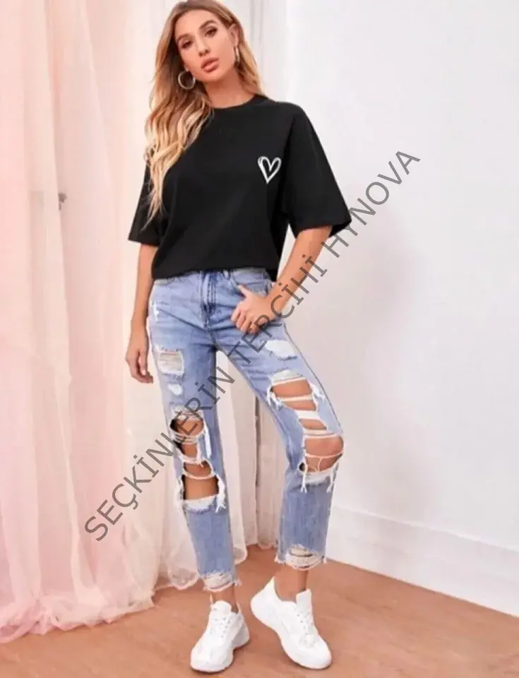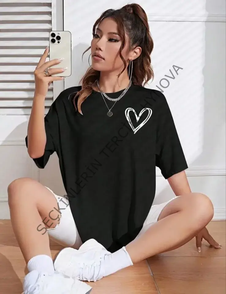 Bisiklet Yaka Baskılı Oversize T-Shirt - Siyah