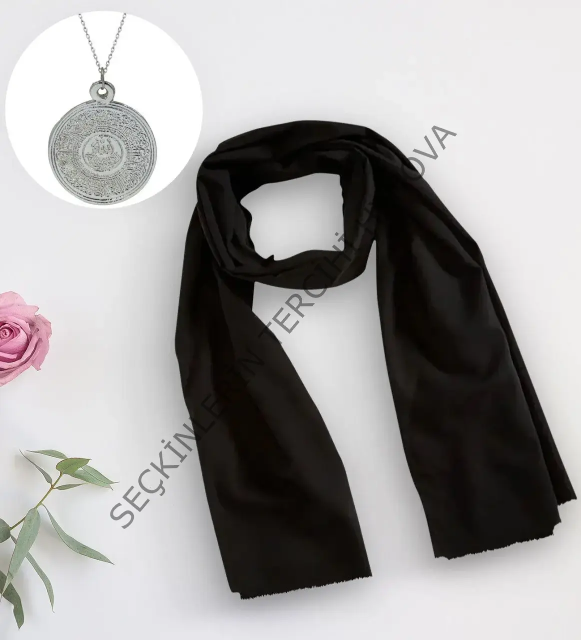 BK Gift Kadınlara Özel Siyah Şal ve Kabartmalı Silver Ayetel Kürsi Kolye