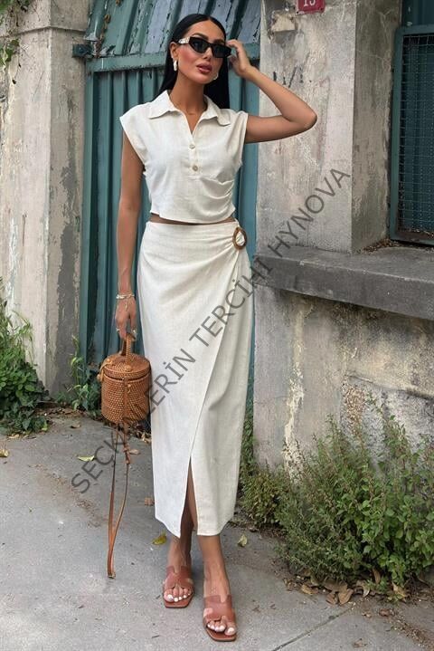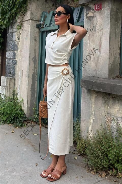 Bluzu Büzgülü Ve Eteği Tokalı Keten Takım 10204
