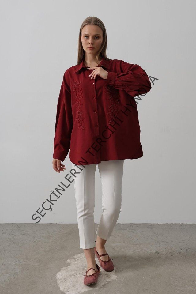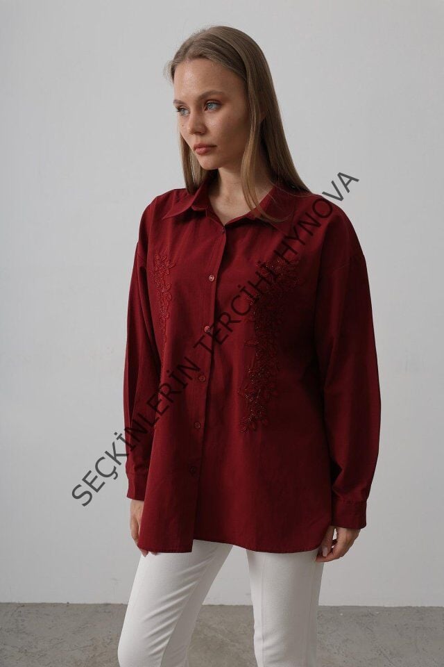 Boncuk Nakış Detaylı Uzun Gömlek - Bordo