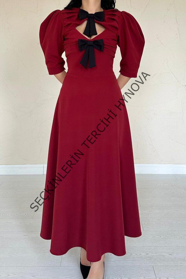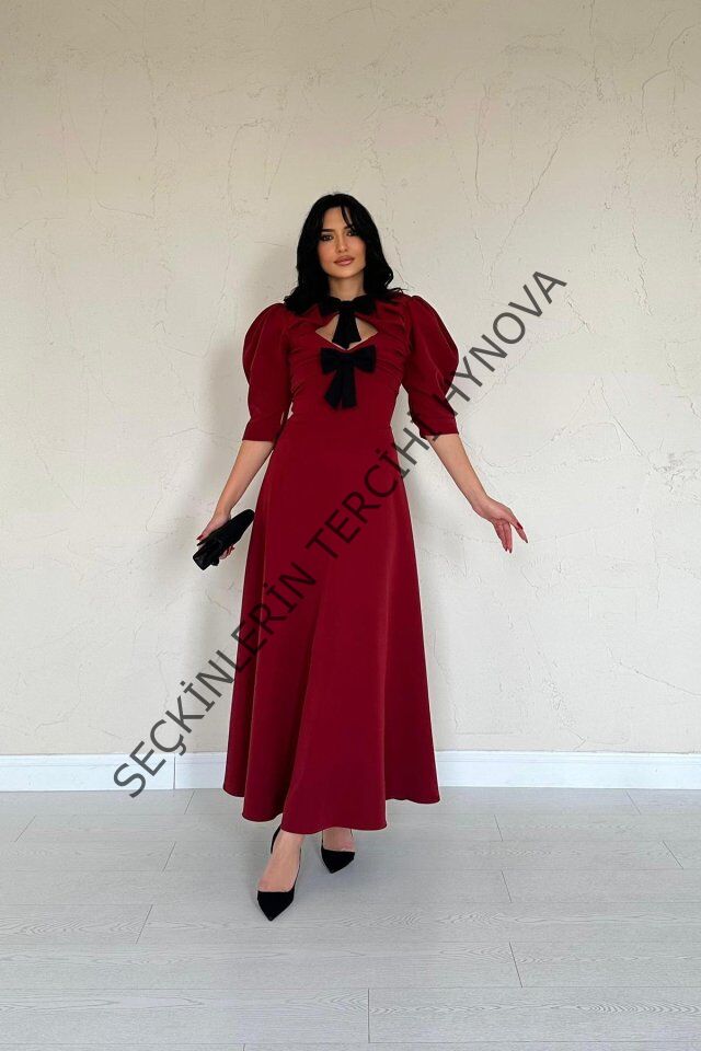 Bordo Ön Dekolteli Fiyonk Garnili Uzun Elbise