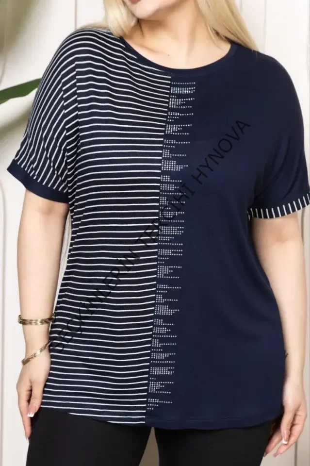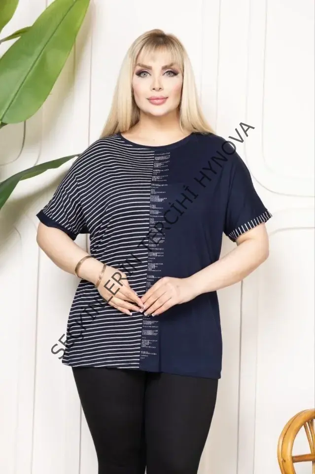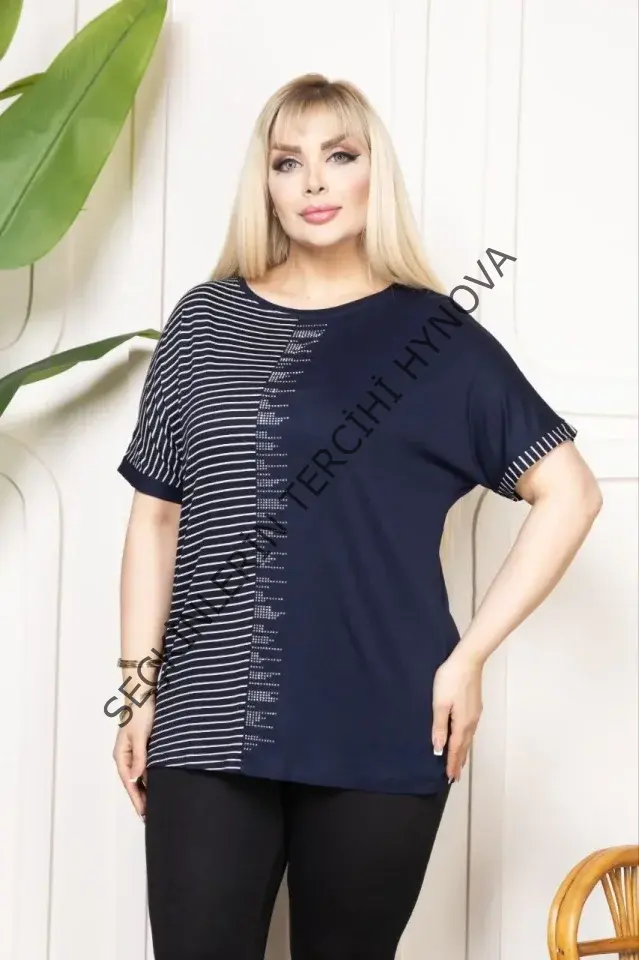 Büyük Beden Taş Detaylı Çizgili Viskon Tişört Bisiklet Yaka Rahat Kesim - Lacivert