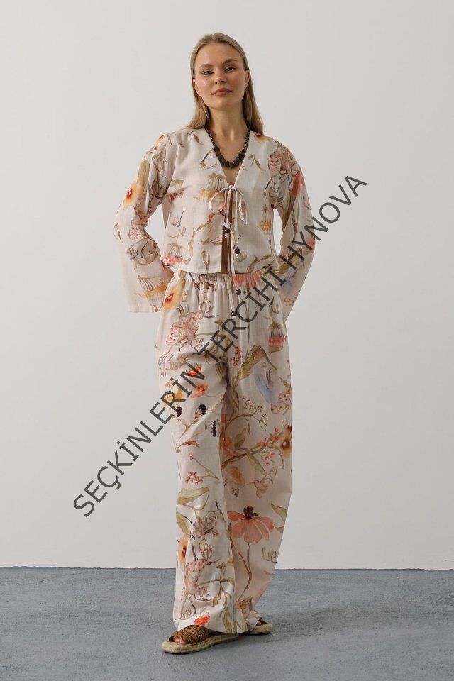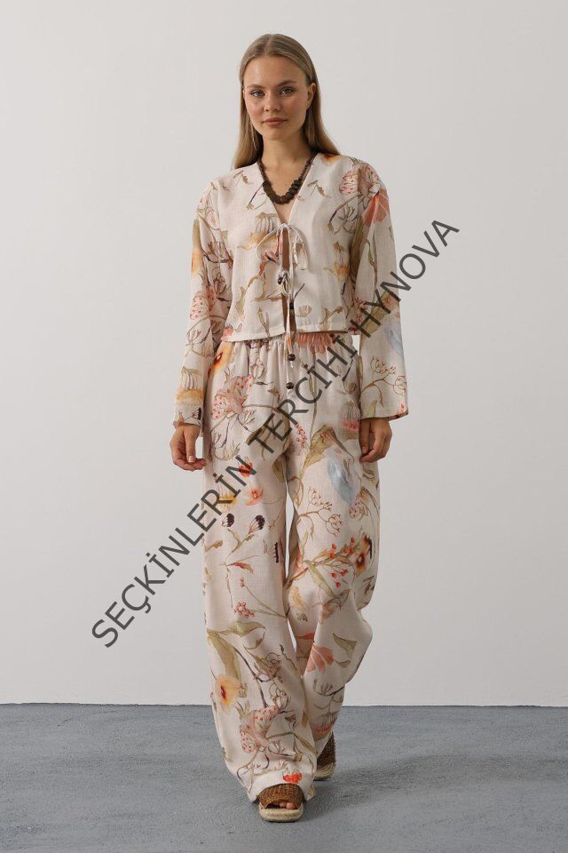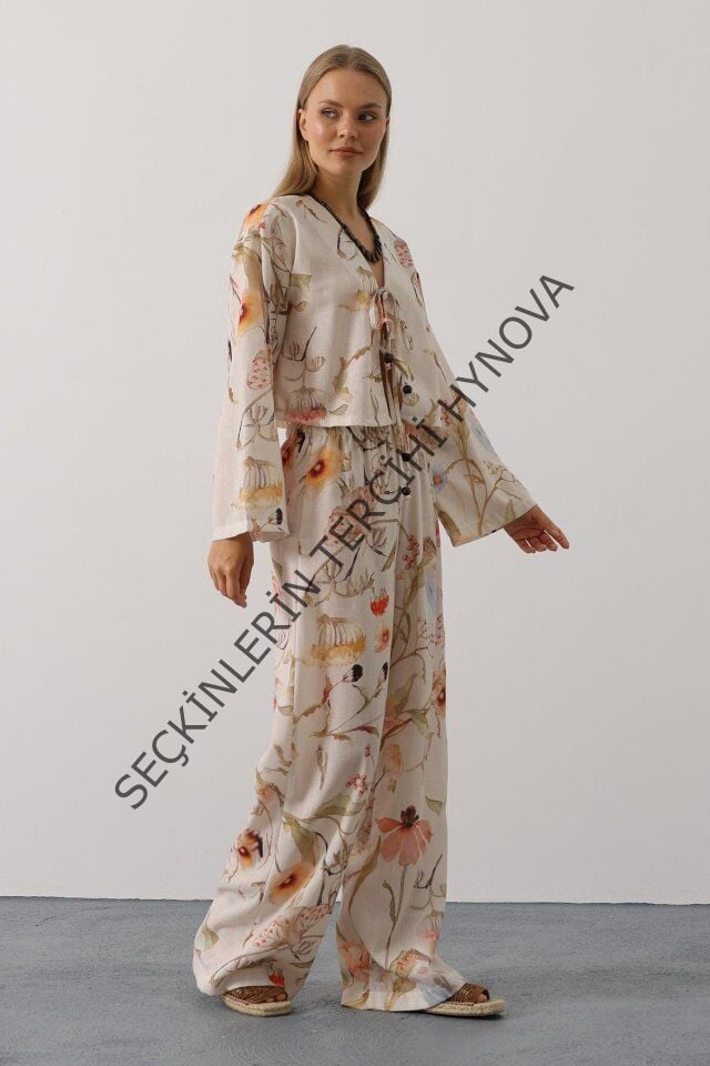 Çiçek Desen Önü Bağlamalı Pantolon Takım - Taş