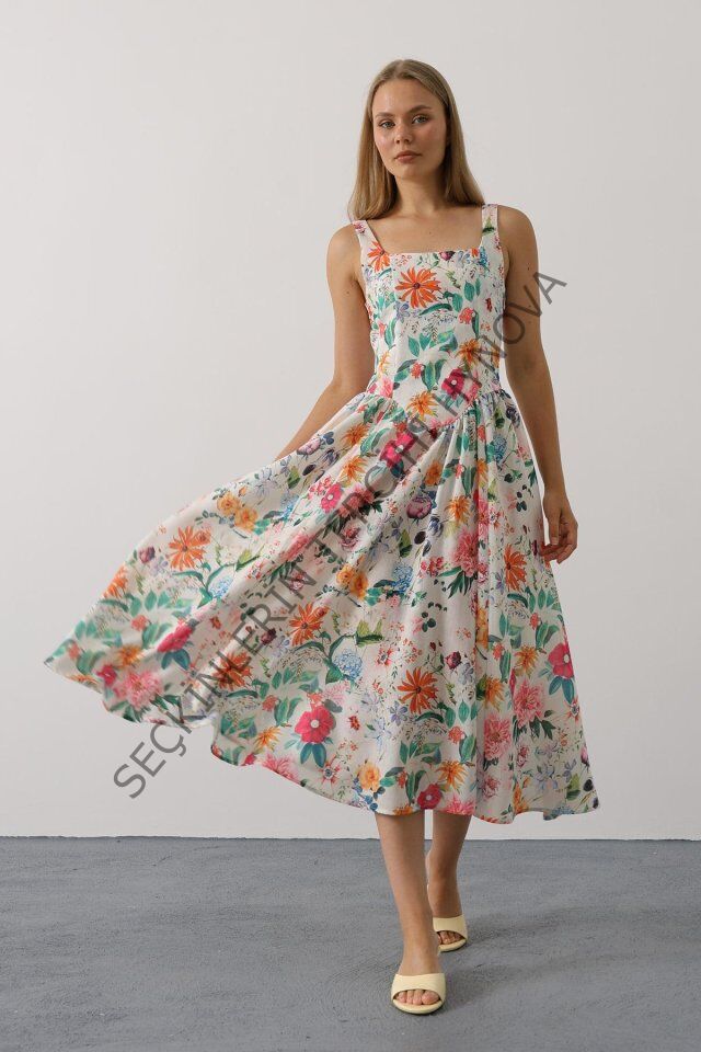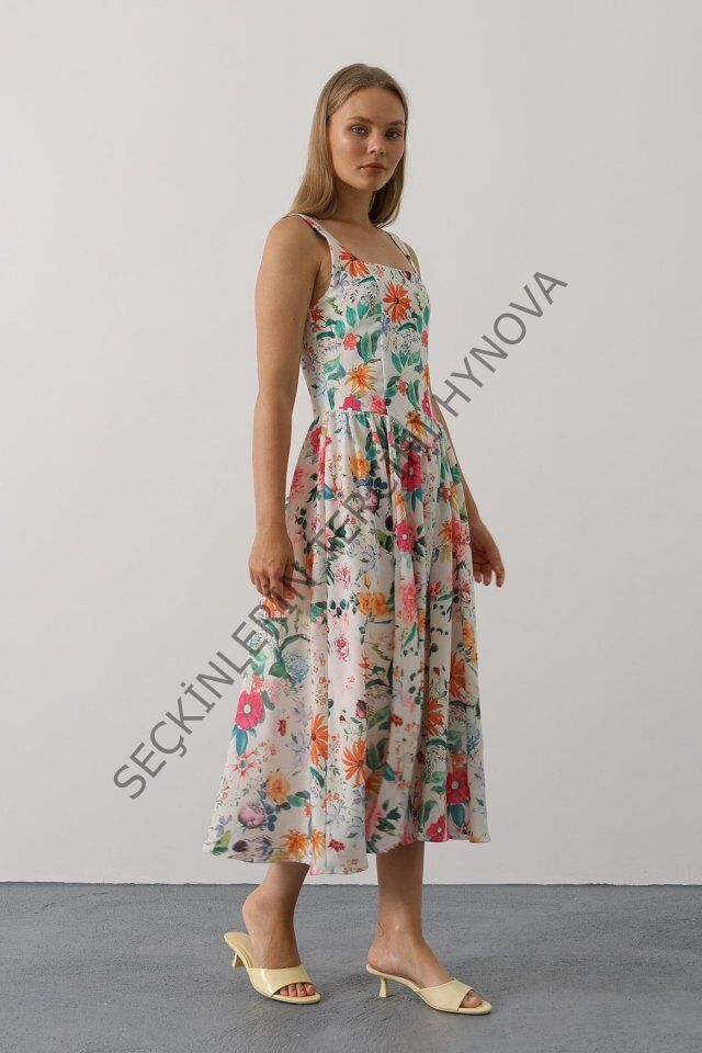 Çiçek Desenli Askılı Elbise - Pembe Çiçek