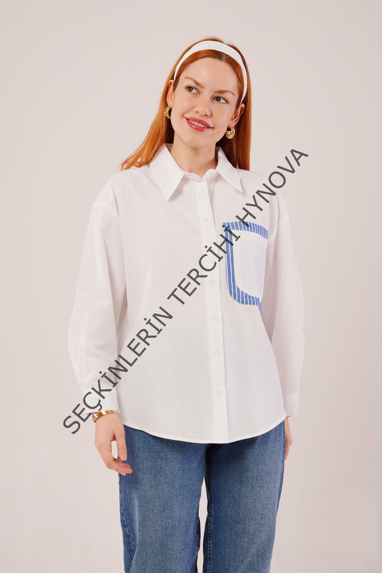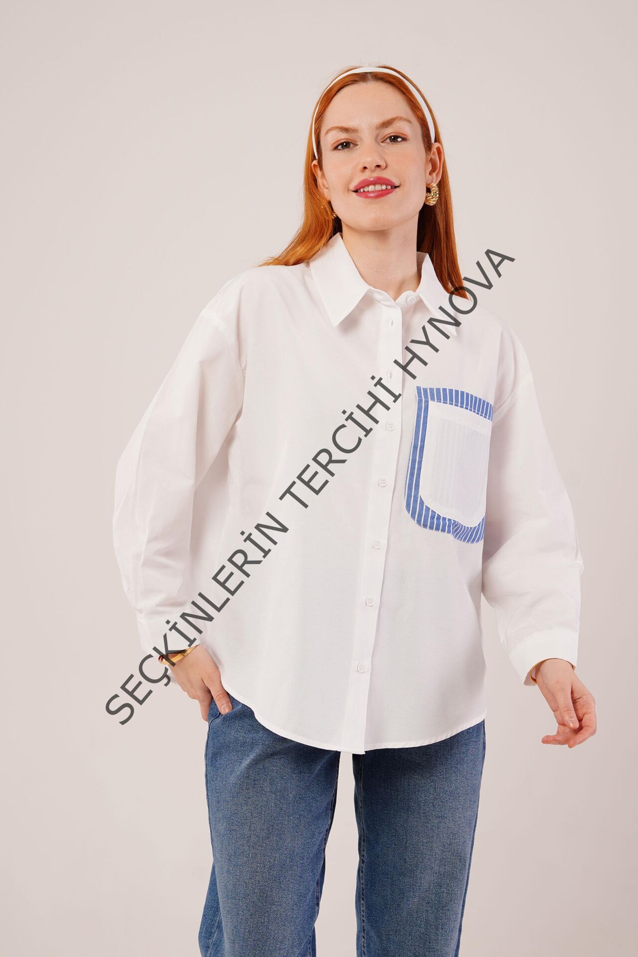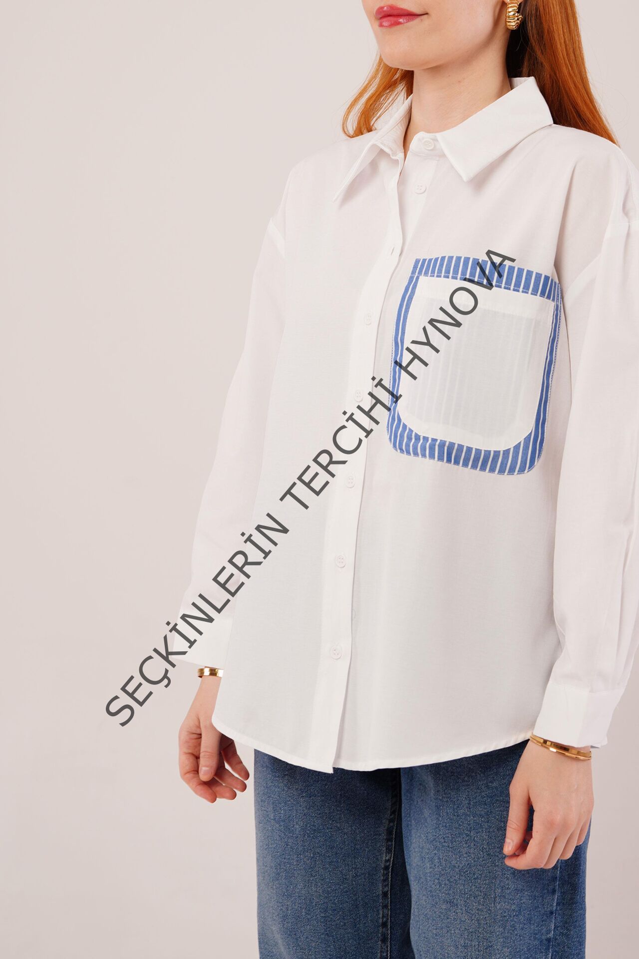 Çizgili Cep Detaylı Beyaz Gömlek