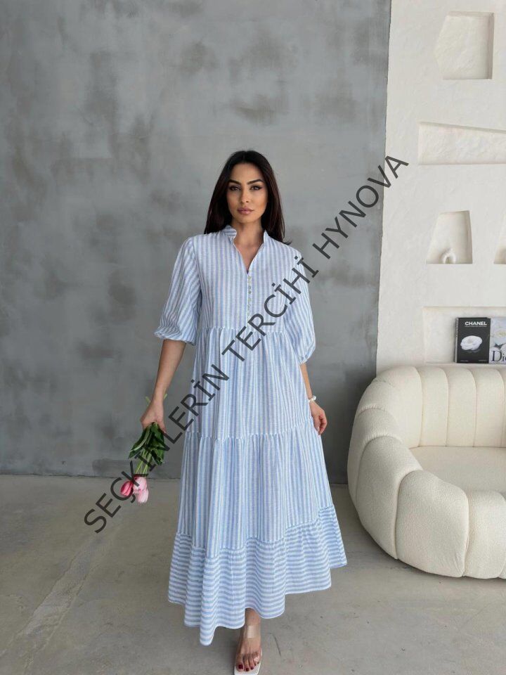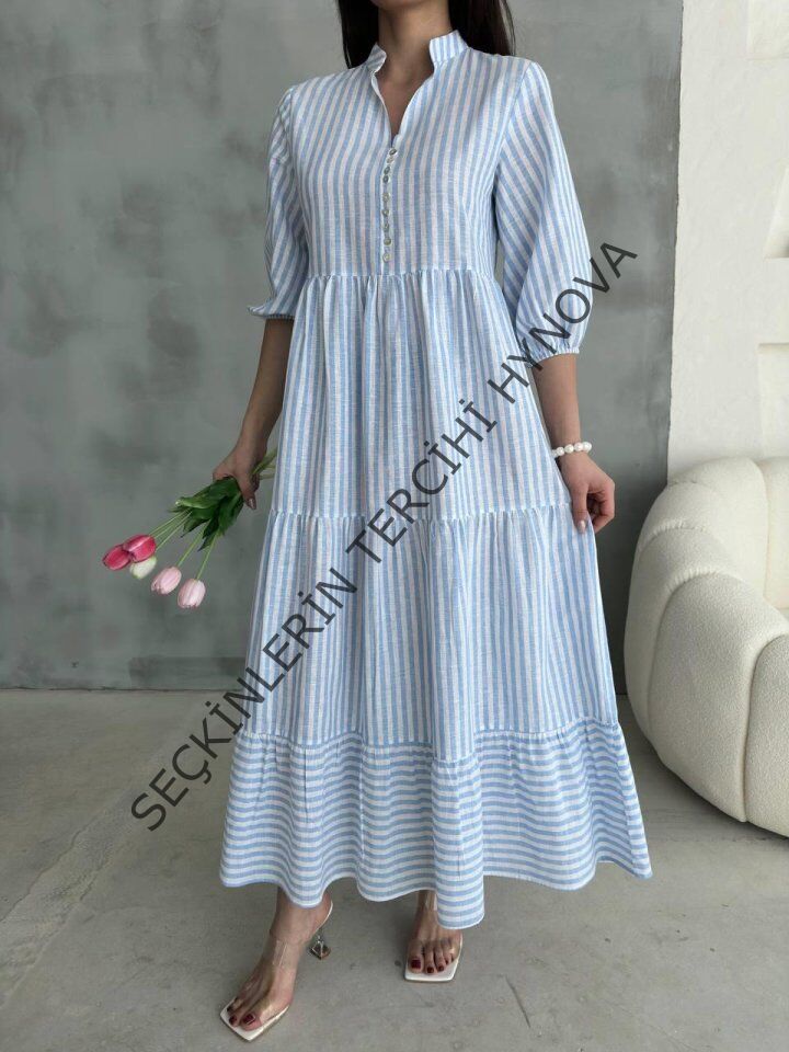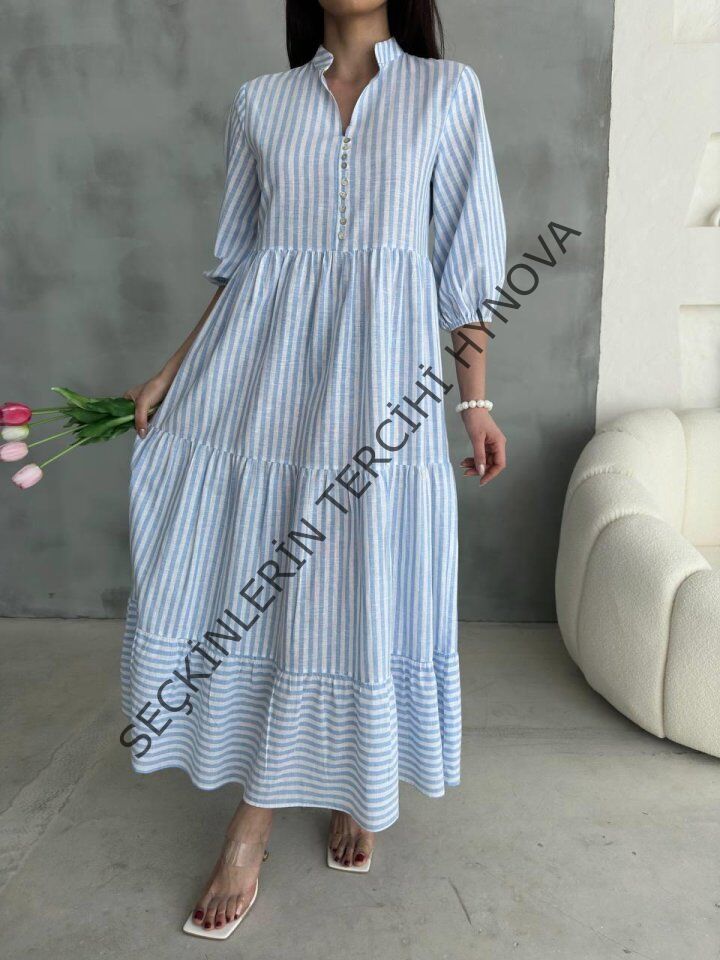 ÇİZGİLİ KETEN HAKİM YAKA DÜĞMELİ SALAŞ ELBİSE - Mavi