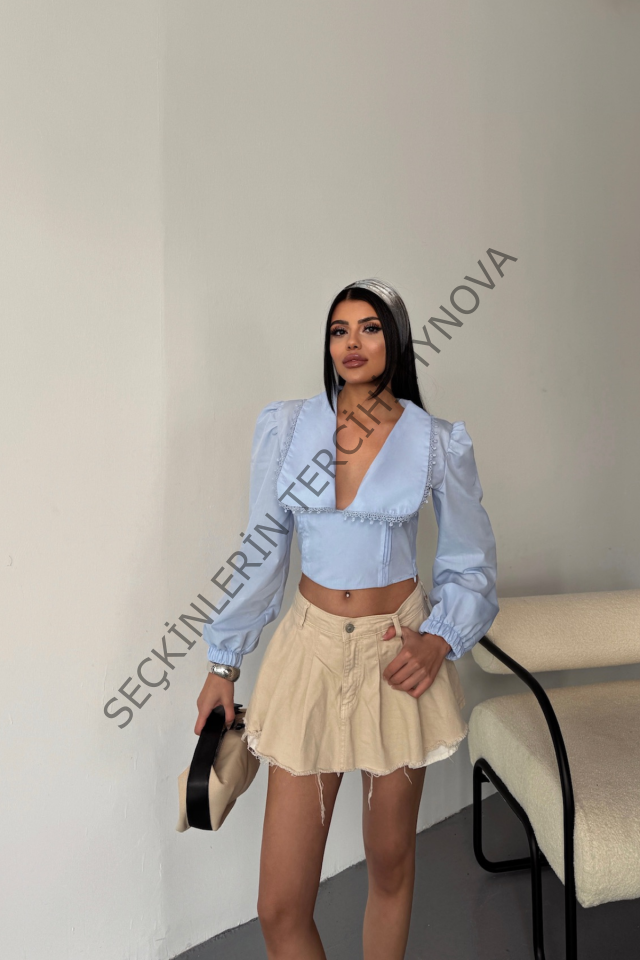 CROP POPLİN GÖMLEK YAKA KENAR DANTEL DETAYLI - Bebe Mavi