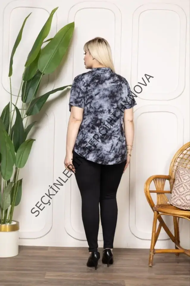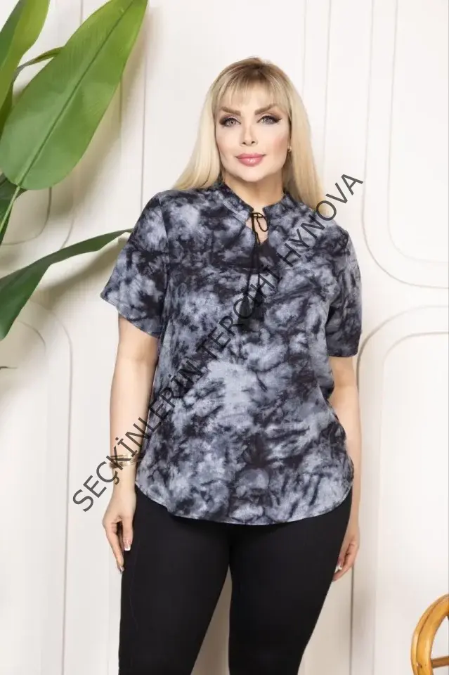 Desenli Püsküllü Viskon Bluz Bebe Yaka Kısa Kollu Big Size Rahat Kesim - Desenli
