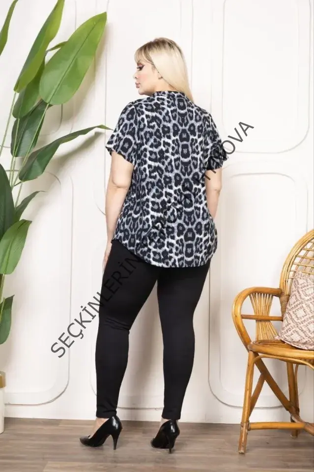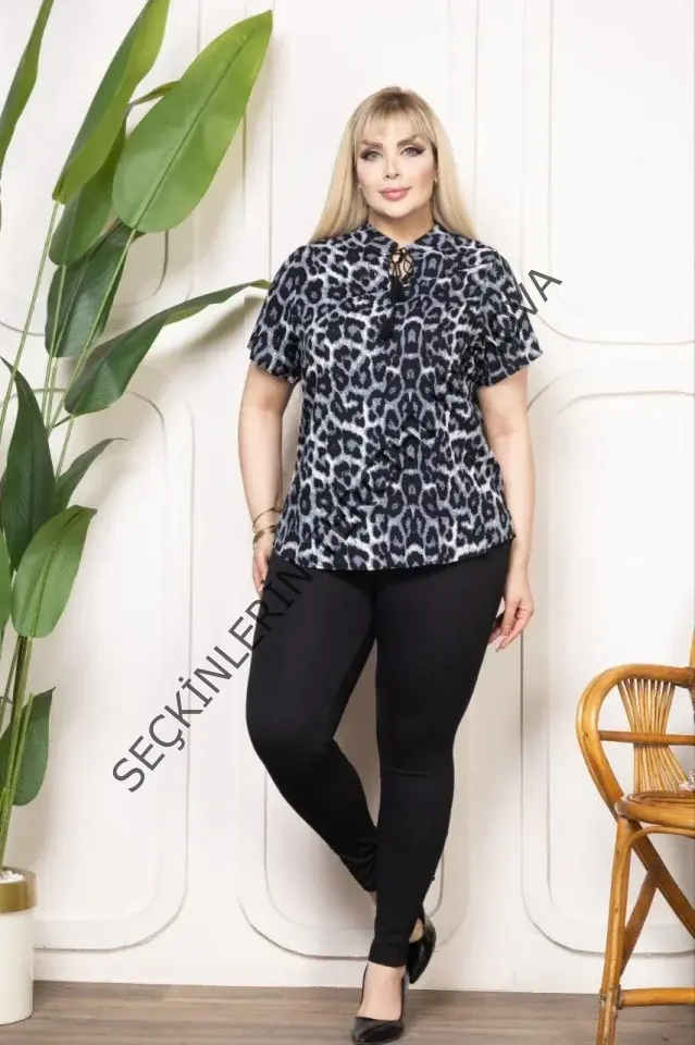 Desenli Püsküllü Viskon Bluz Bebe Yaka Kısa Kollu Big Size Rahat Kesim - Desenli
