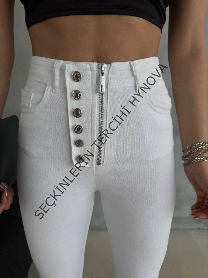 DÜĞME VE FERMUARLI KOT PANTOLON - Beyaz