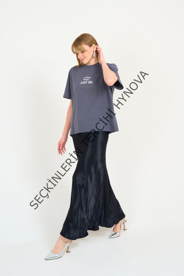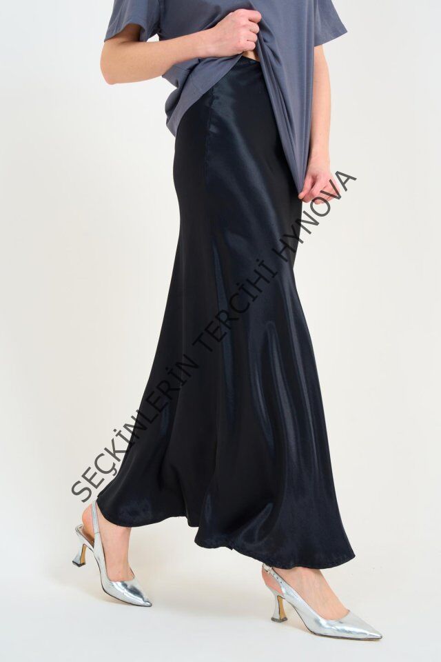 Düz Uzun Saten Etek - Siyah