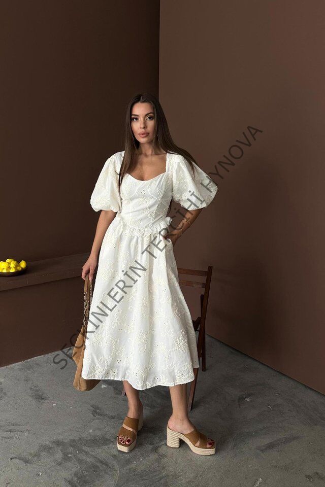 Ekru Balon Kollu Dantelli Brode Elbise