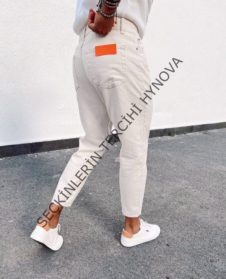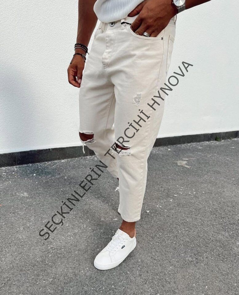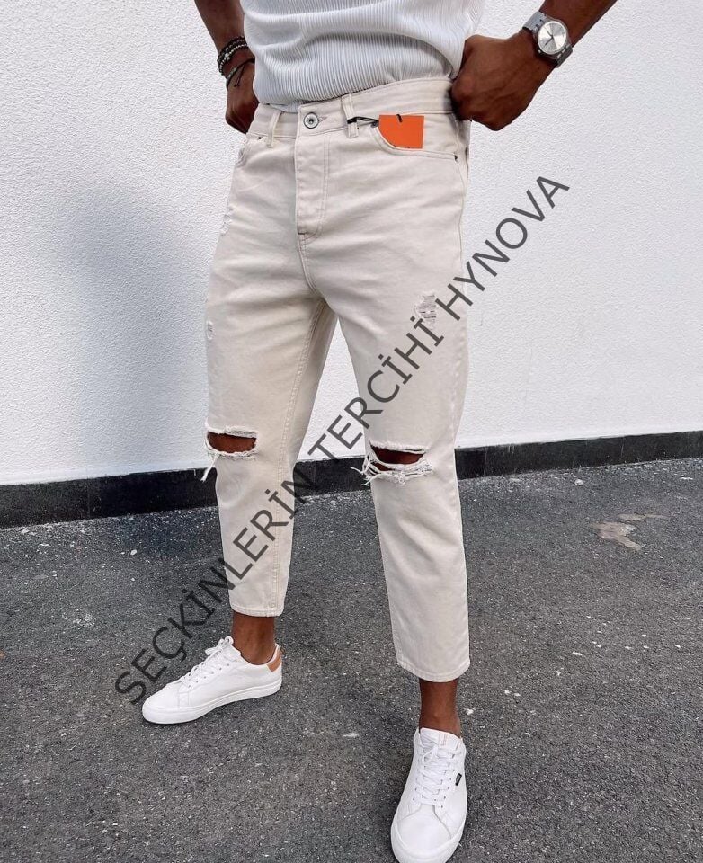 Erkek Açık Krem Yırtık Detaylı Boyfriend Jean