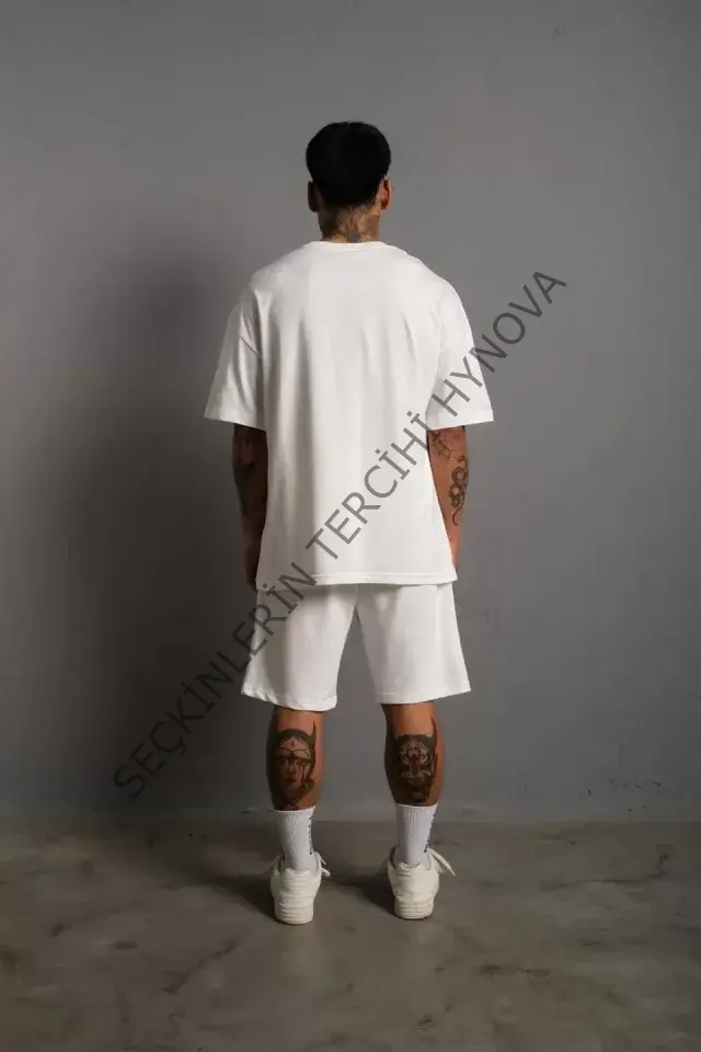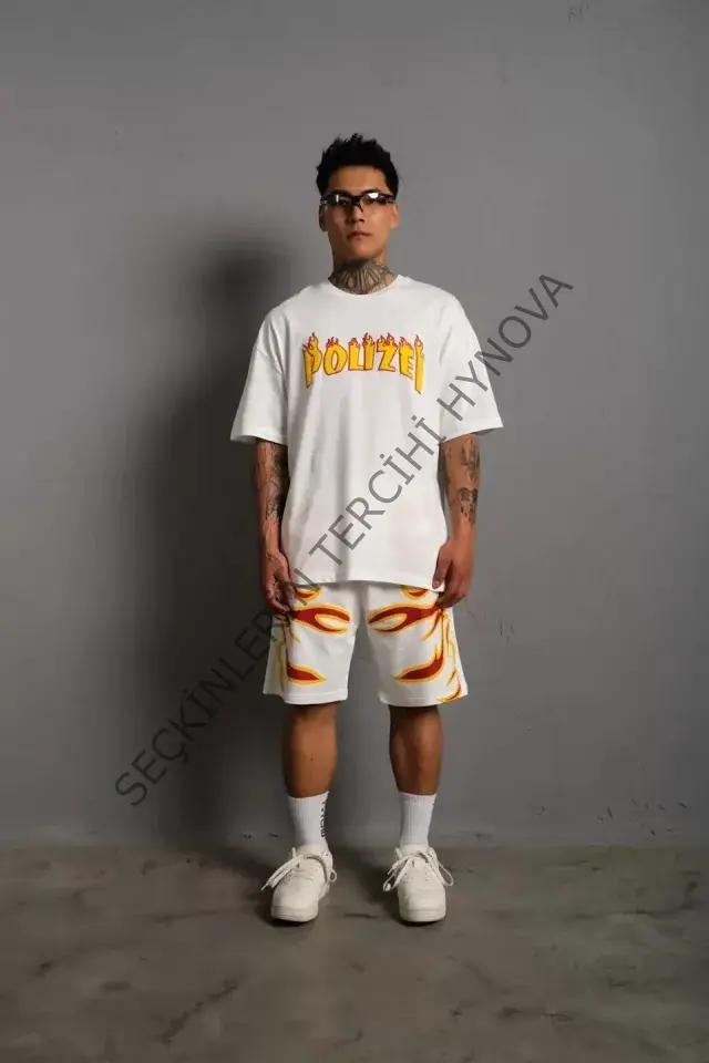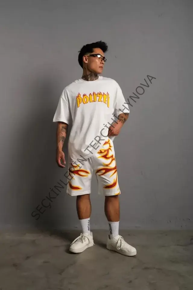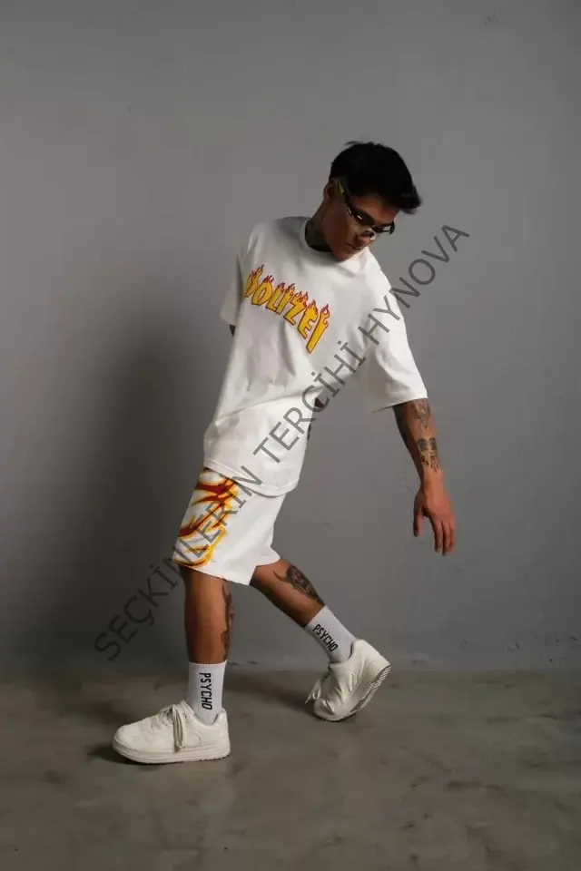 Erkek Alev Baskılı İkili Şortlu Takım - Beyaz