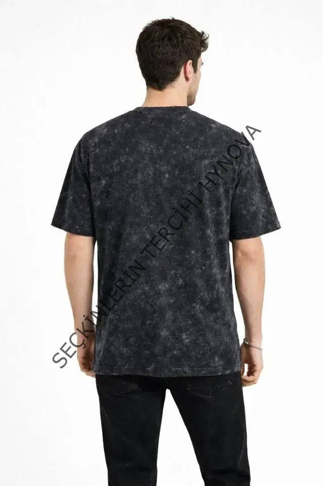 Erkek Asit Yıkama Bisiklet Yaka Kısa Kollu Oversize T-Shirt Tişört - Siyah