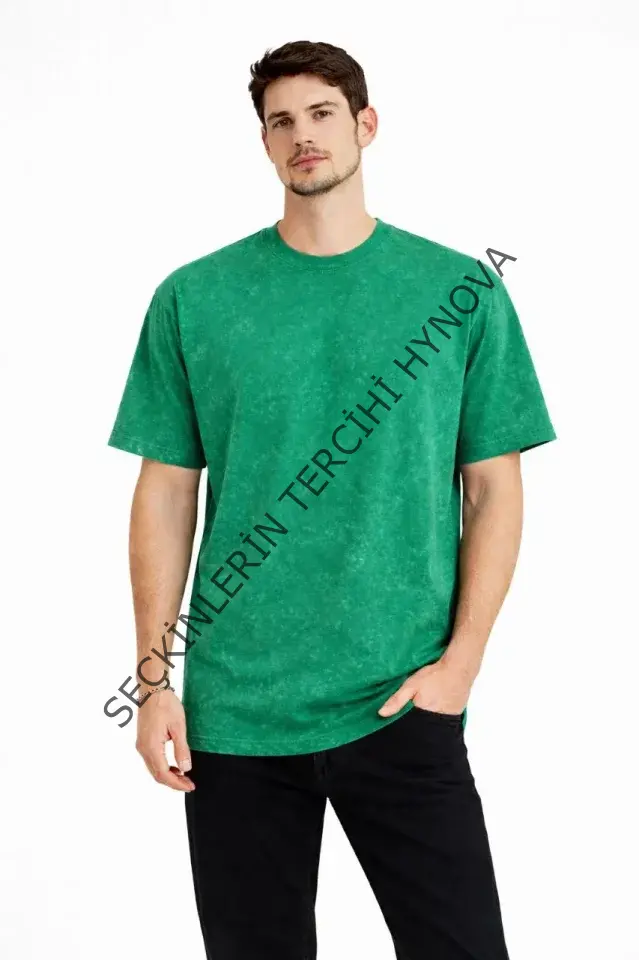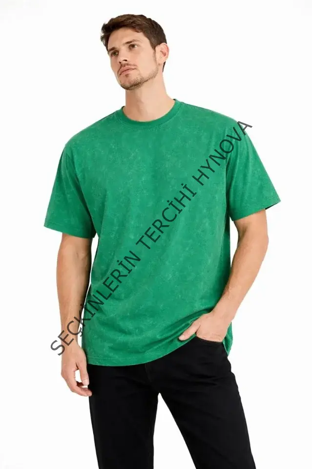 Erkek Asit Yıkama Bisiklet Yaka Kısa Kollu Oversize T-Shirt Tişört - Yeşil