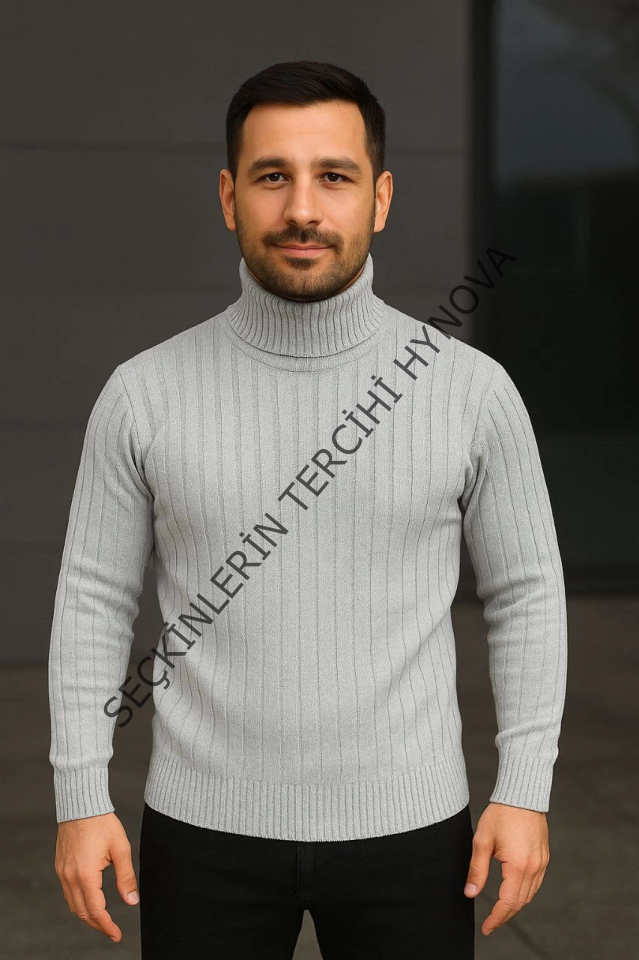 Erkek Balıkcı Yaka Bağazlı Triko Kazak Pamuklu Kalın Fitilli Dokuma, Regular Fit Uzun Kollu Kışlık Model - Gri