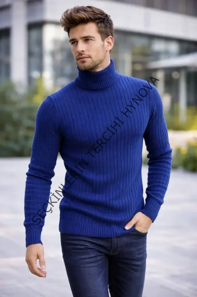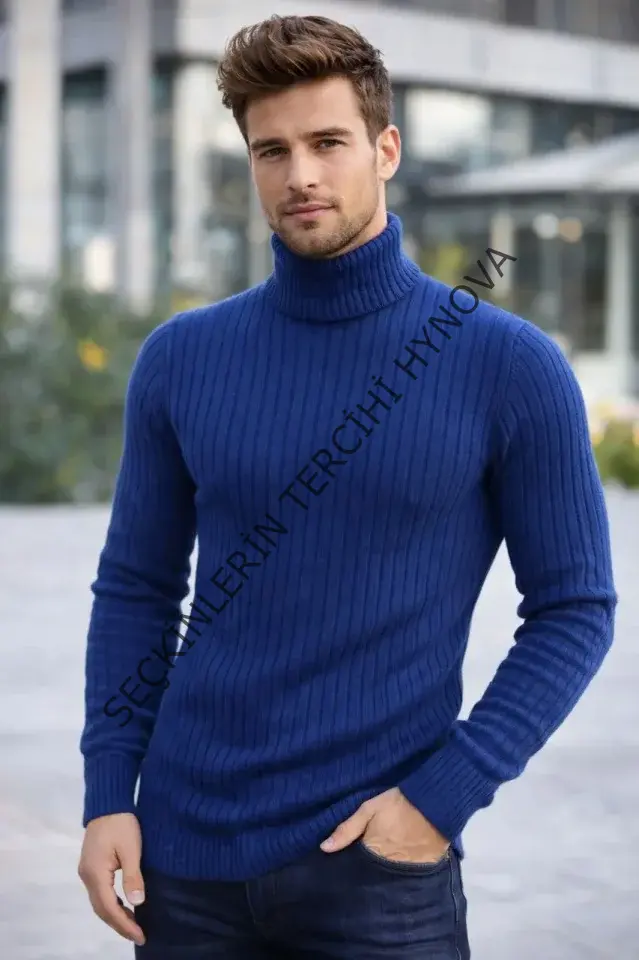 Erkek Balıkcı Yaka Bağazlı Triko Kazak Pamuklu Kalın Fitilli Dokuma, Regular Fit Uzun Kollu Kışlık Model - İndigo