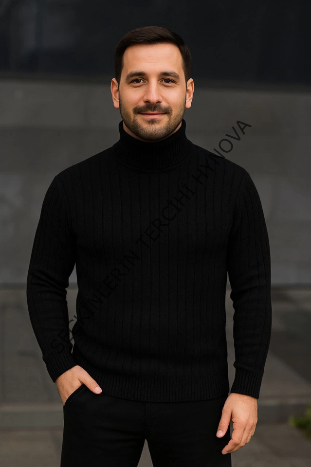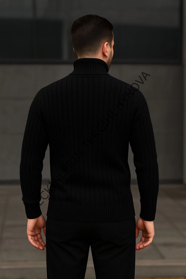 Erkek Balıkcı Yaka Bağazlı Triko Kazak Pamuklu Kalın Fitilli Dokuma, Regular Fit Uzun Kollu Kışlık Model - Siyah