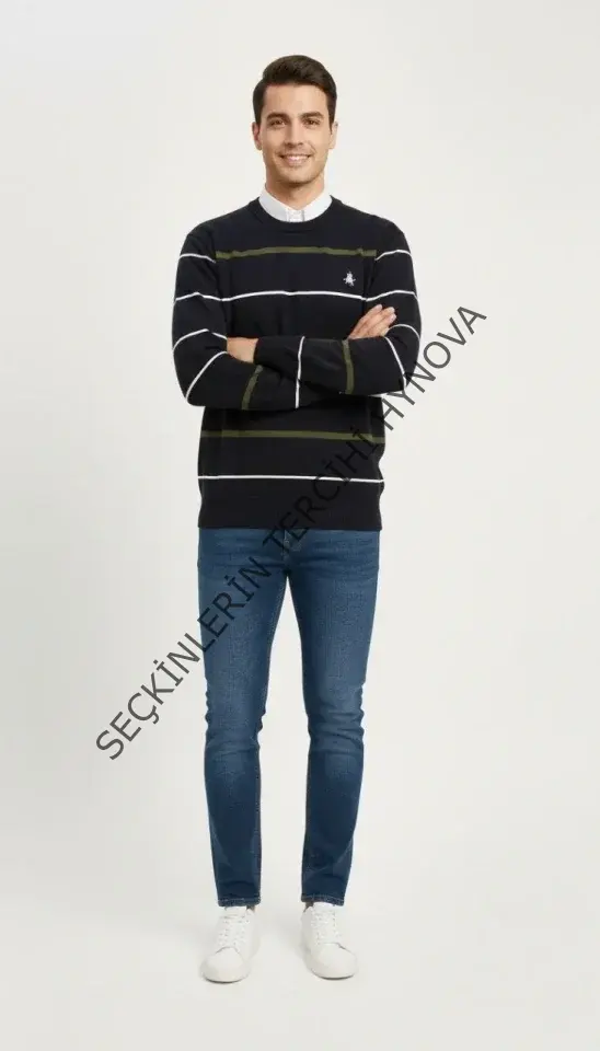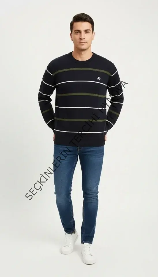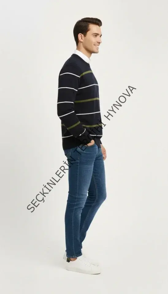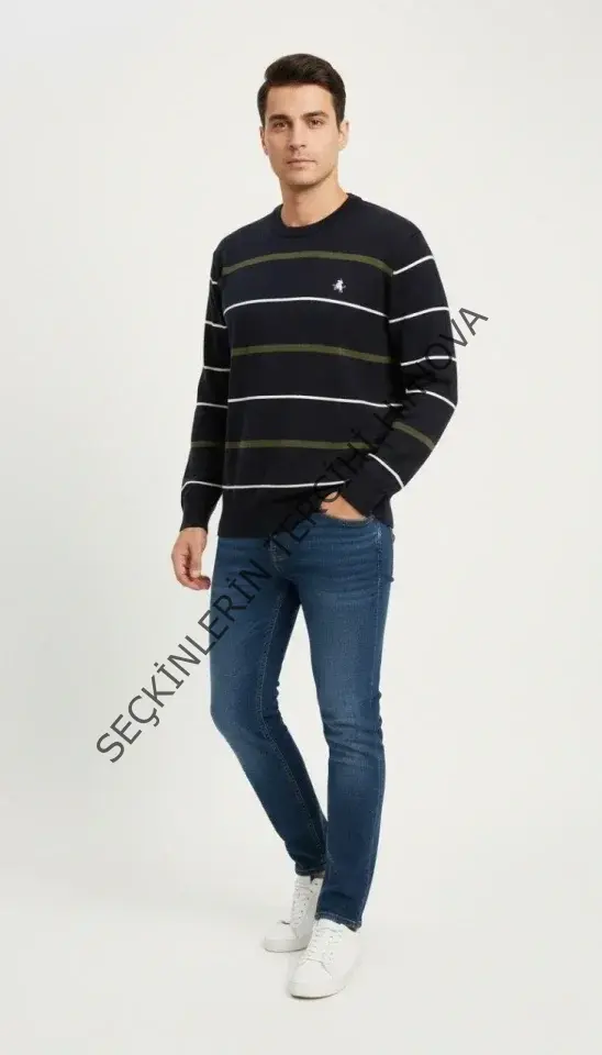 Erkek Bisiklet Yaka Cizgili Triko Kazak Yumuşak Dokulu Pamuklu Ince Dokuma, Uzun Kollu Rahat Regular Kalıp - Lacivert