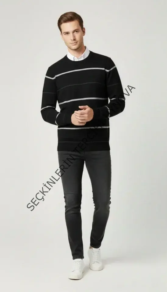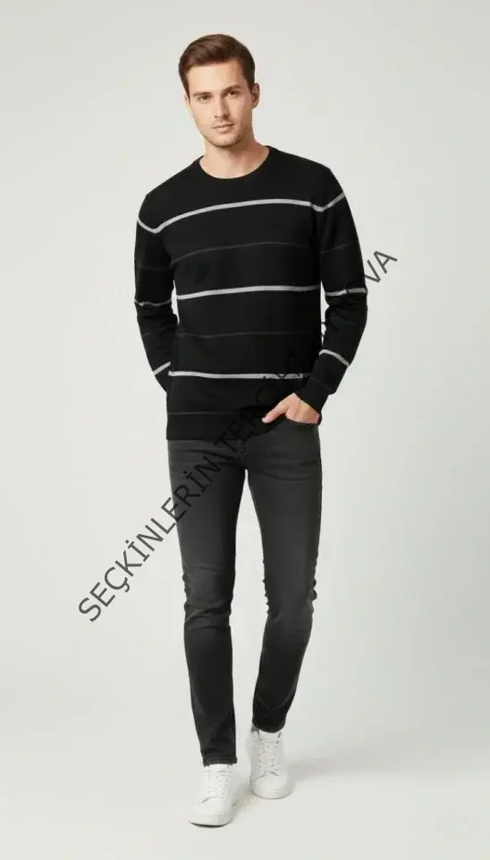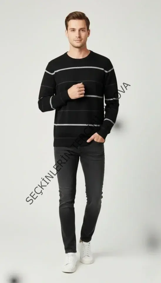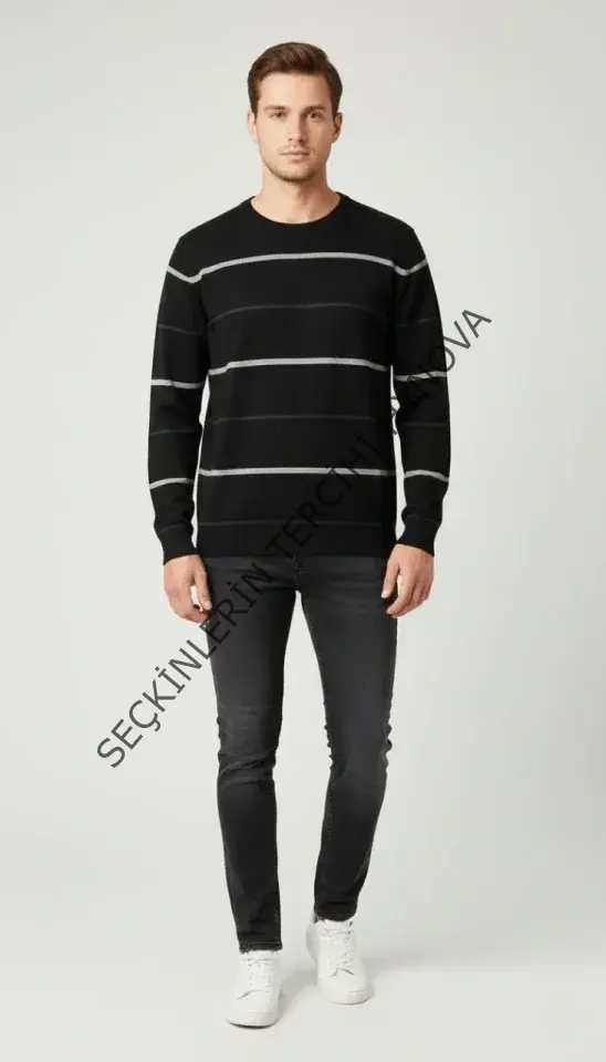 Erkek Bisiklet Yaka Cizgili Triko Kazak Yumuşak Dokulu Pamuklu Ince Dokuma, Uzun Kollu Rahat Regular Kalıp - Siyah