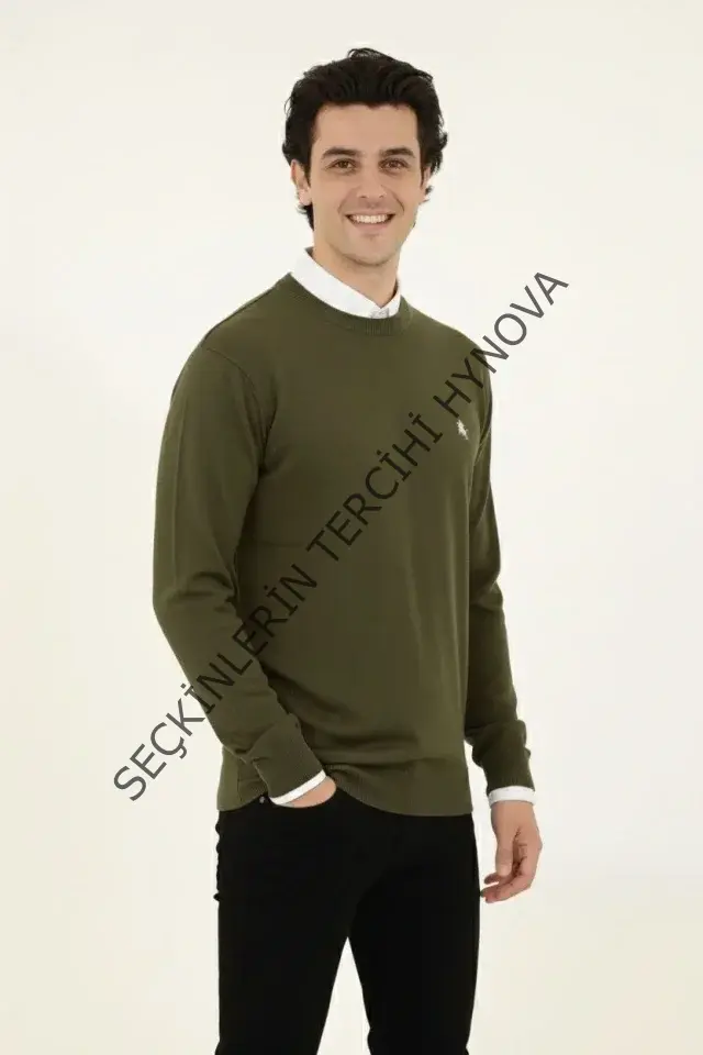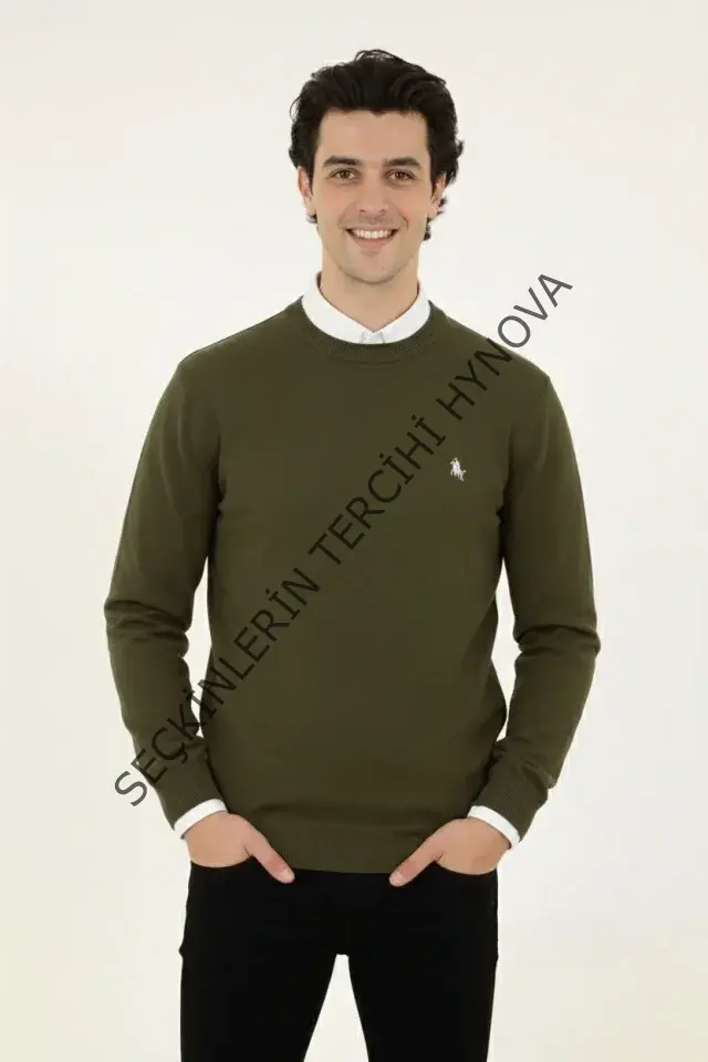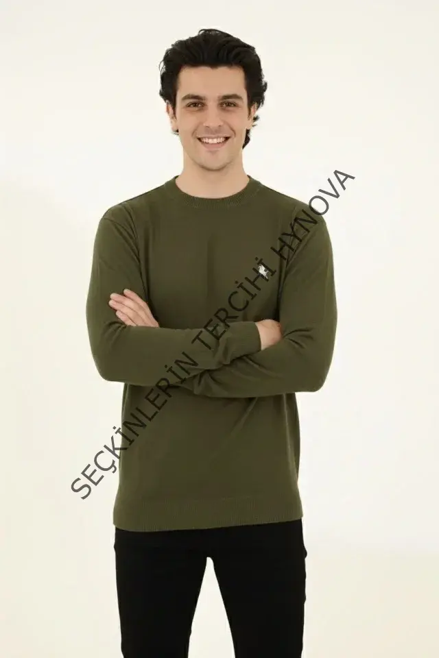 Erkek Bisiklet Yaka Nakış Işlemeli Triko Kazak Yumuşak Dokulu Pamuklu Ince Dokuma, Uzun Kollu Rahat Regular Kalıp - Haki