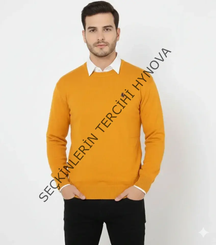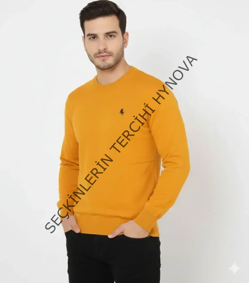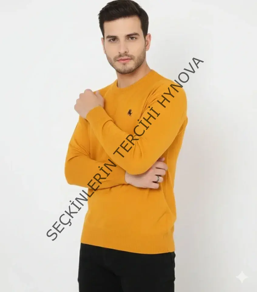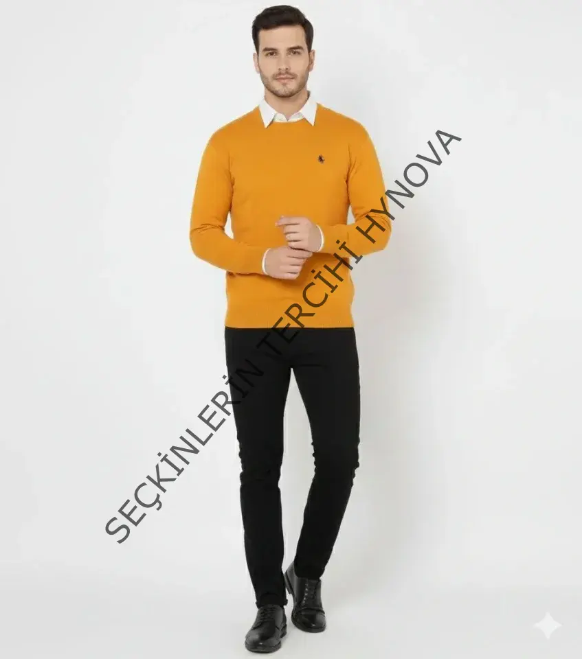 Erkek Bisiklet Yaka Nakış Işlemeli Triko Kazak Yumuşak Dokulu Pamuklu Ince Dokuma, Uzun Kollu Rahat Regular Kalıp - Turuncu